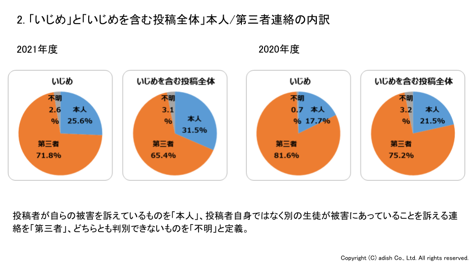 2.「いじめ」と「いじめを含む投稿全体」本人/第三者連絡の内訳―被害者本人からのSOSが増加