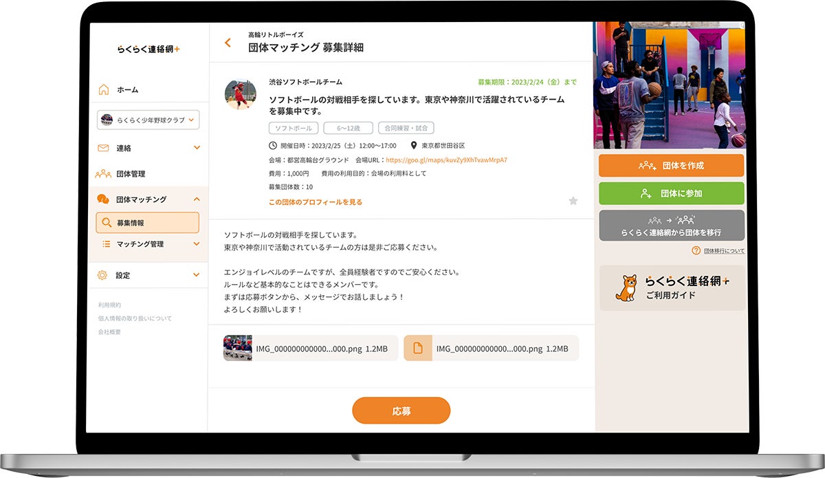 「らくらく連絡網+」を使っているスポーツ団体同士で、サッカー、野球、ソフトボールなどの試合相手や練習相手を募ることができるようになりました。団体ジャンルや、エリア、年齢などを絞り込んで団体を探すことも可能です。