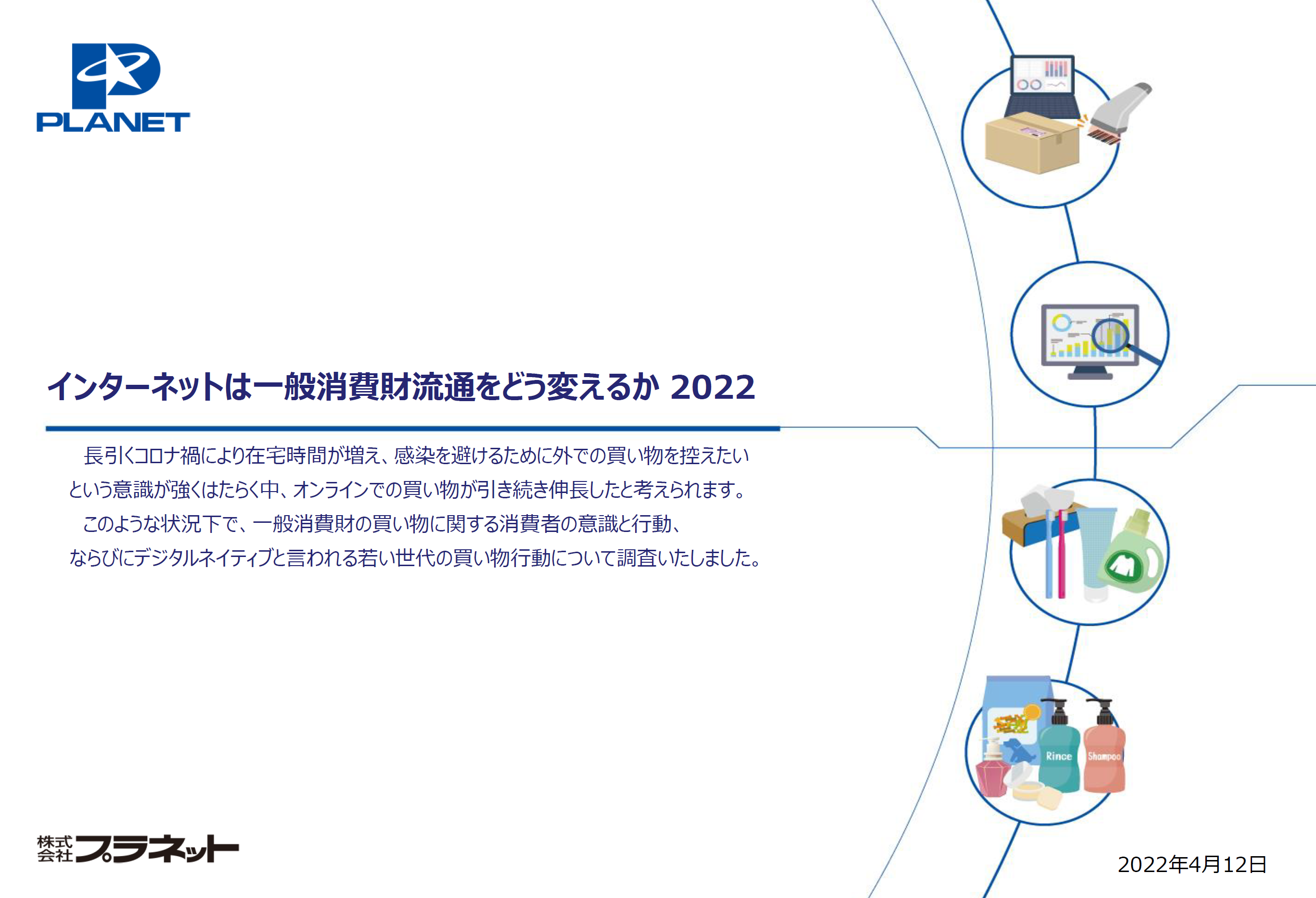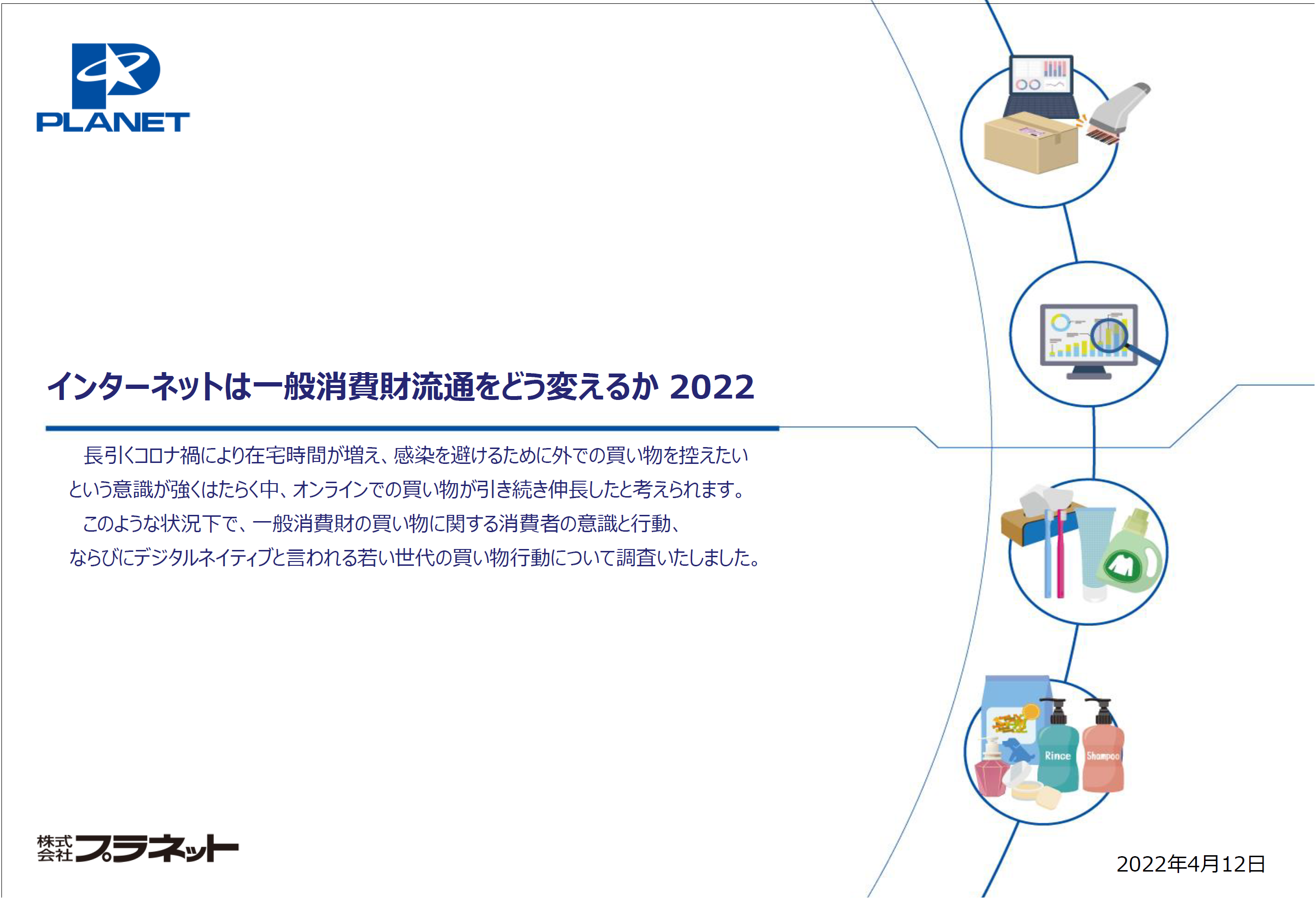 株式会社プラネット(本社:東京都港区、代表取締役社長:田上正勝、証券コード:2391)は、コロナ禍が長引く中、昨年に続き日本国内の日常生活への影響と一般消費財の買い物の変化を調査しました。さらに、一般消費財にフォーカスして、インターネットでの買い物についてのインサイト、ならびにデジタルネイティブ世代が利用するメディアや買い物行動に関する調査も実施し、調査レポート「インターネットは一般消費財流通をどう変えるか2022」を発行しました。