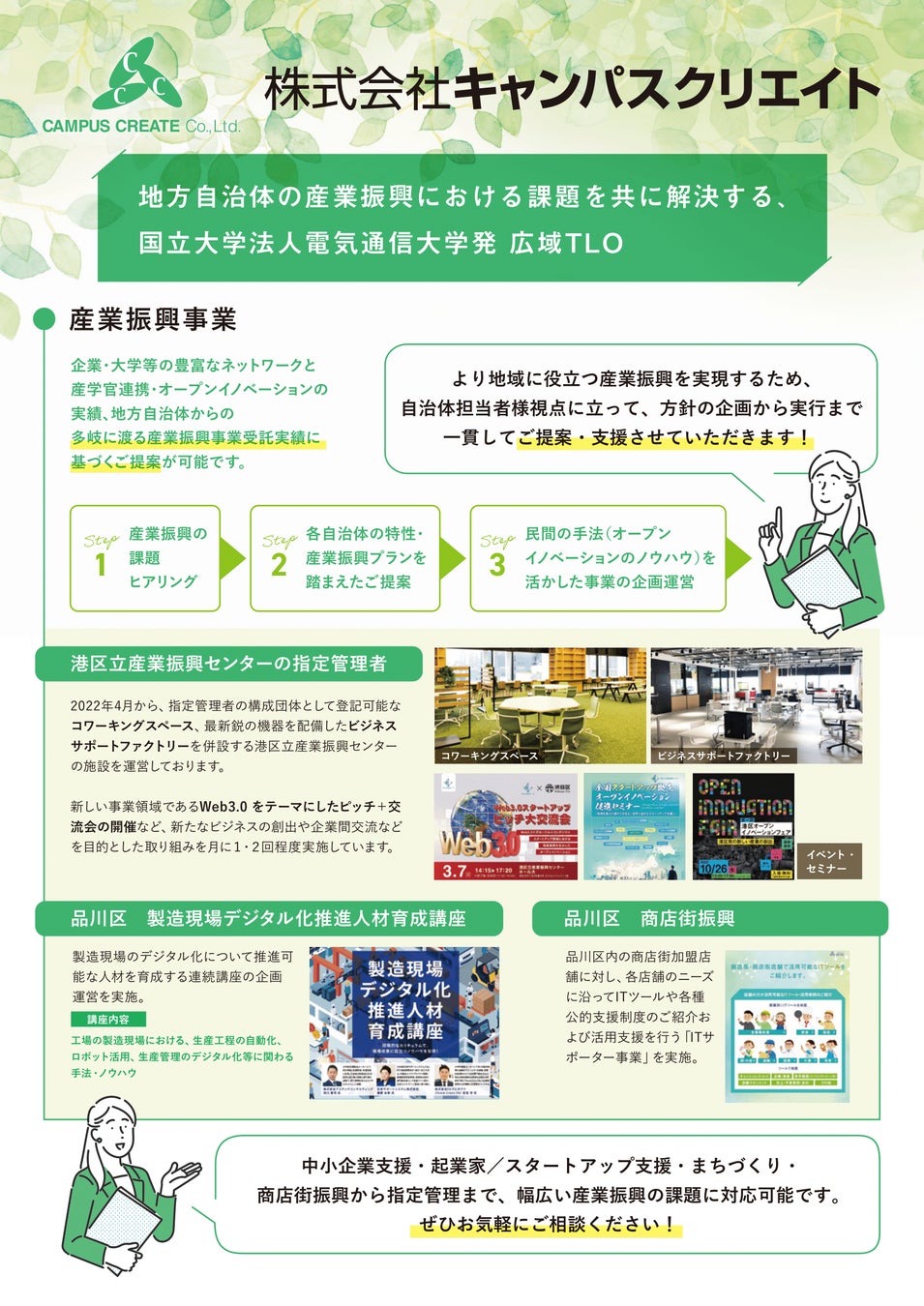 2022年4月から、指定管理者の構成団体として登記可能なコワーキングスペース、最新鋭の機器を配備したビジネスサポートファクトリーを併設する港区立産業振興センターの施設を運営しております。