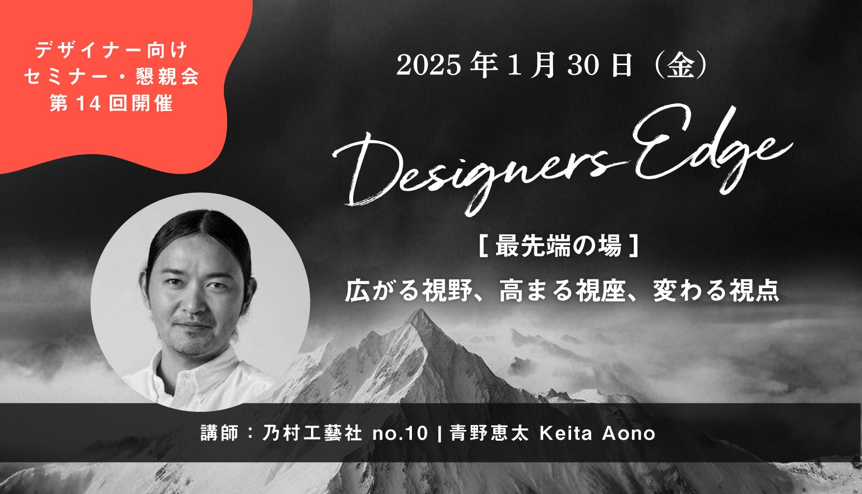 2026年1月30日(金)18:00より開催する第14回「Designers Edge(デザイナーズエッジ)」には、空間デザインの最前線で活躍する青野恵太氏をゲストに迎えます。