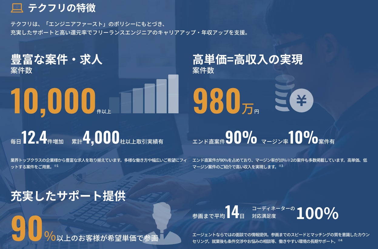 『テクフリ』は「フリーランスエンジニアで今より年収をあげるならテクフリ」をテーマに、職種別・スキル別・単価やエリア、企業など、さまざまな条件から案件を検索いただける案件・求人サイトです。 中間マージン10%の案件やリモート案件など多数掲載しており、ユーザーの皆様の年収アップを支援する案件とサポート体制が充実しています。