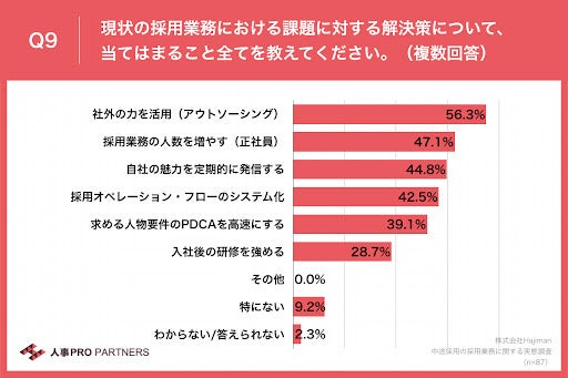- 採用業務課題に対する解決策、「社外の力を活用(アウトソーシング)」が56.3%で最多