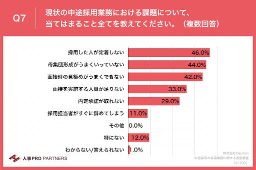 - 中途採用業務における課題、「採用した人が定着しない」が46.0%で最多