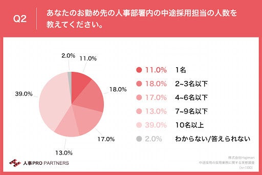 - 人事部署内の中途採用担当の人数、「10名以上」が39.0%で最多