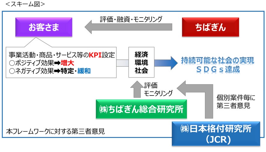 融資検討時に実施する評価は、当行とグループ会社である株式会社ちばぎん総合研究所が共同して行い、事業者さまのKPI(目標)設定やその進捗管理を支援します。また、個別案件毎に当行と株式会社ちばぎん総合研究所が共同して実施した評価について、株式会社日本格付研究所より第三者意見※1を取得することで客観性を担保します。