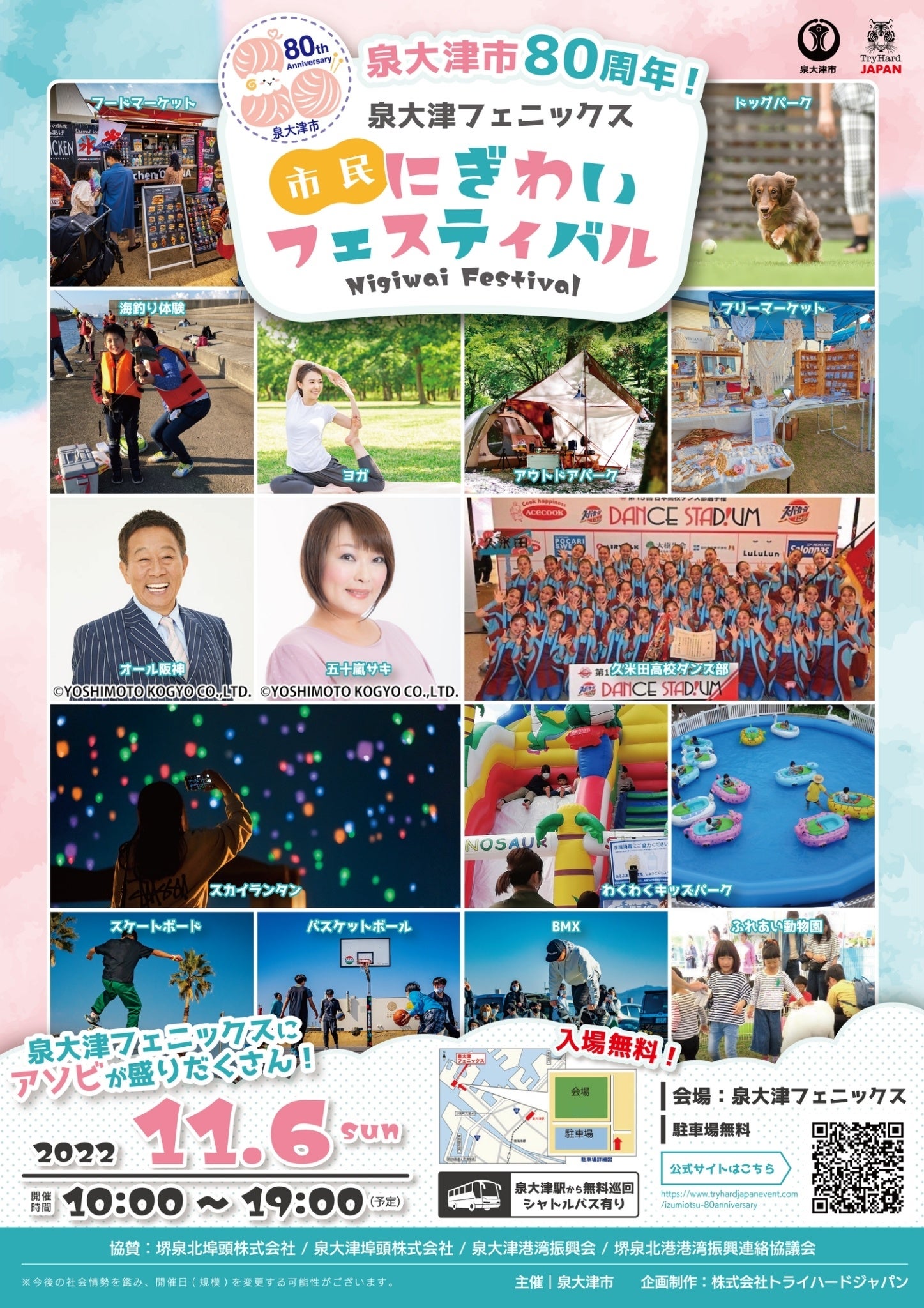 その他、泉大津の特産品を扱うフードマーケットや、フリーマーケットなど泉大津市の魅力満載の内容で市制80周年を祝します。