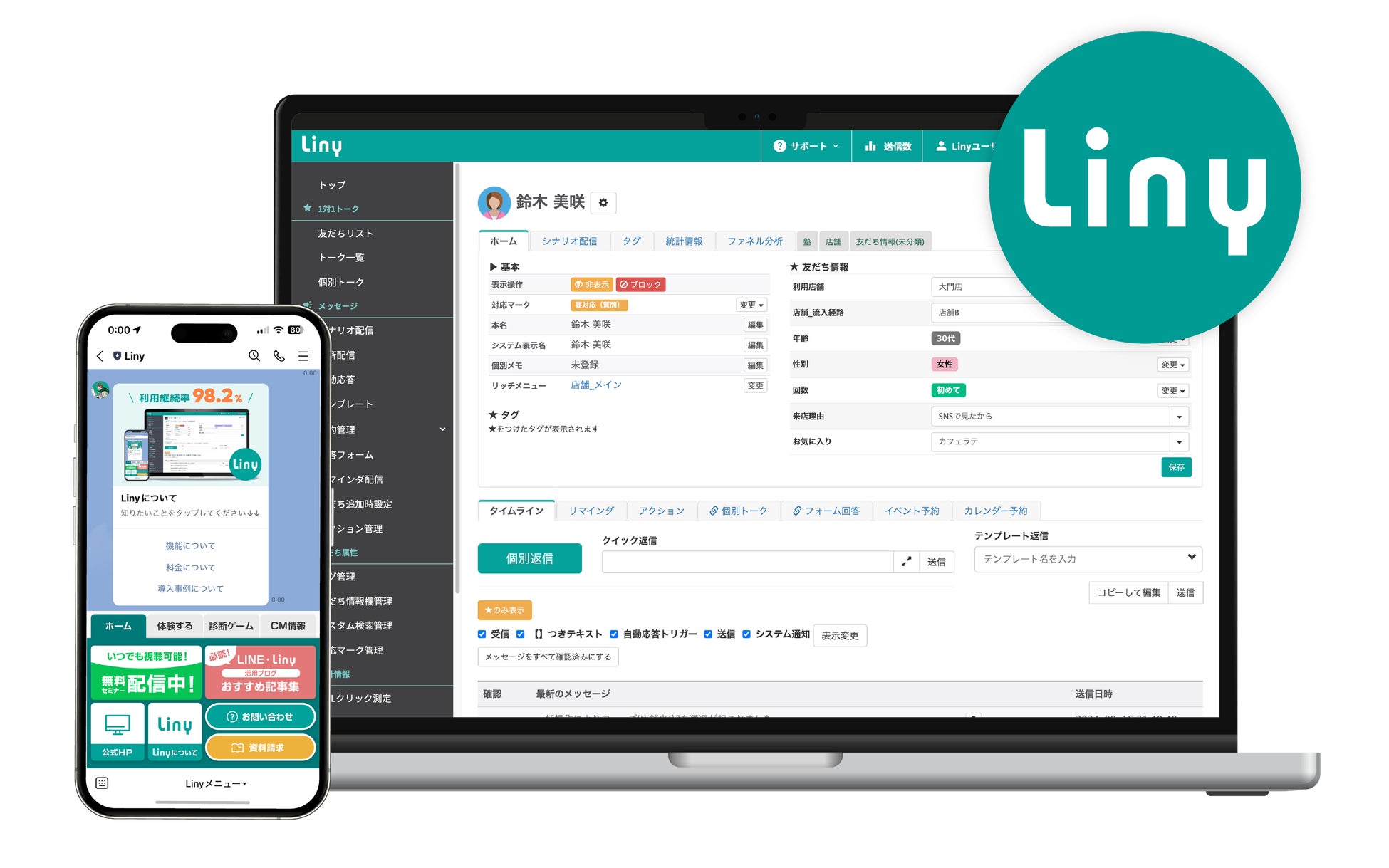 『Liny』はLINE公式アカウントの機能に加えてセグメント配信・顧客管理・自動応答・流入経路分析などの機能を備えた機能拡張ツールです。『Liny』を用いてユーザーの行動、属性、嗜好にあわせた1to1のマーケティングを実現することができます。都道府県自治体や省庁、教育機関や士業・金融・人材業界など幅広く導入実績がございます。