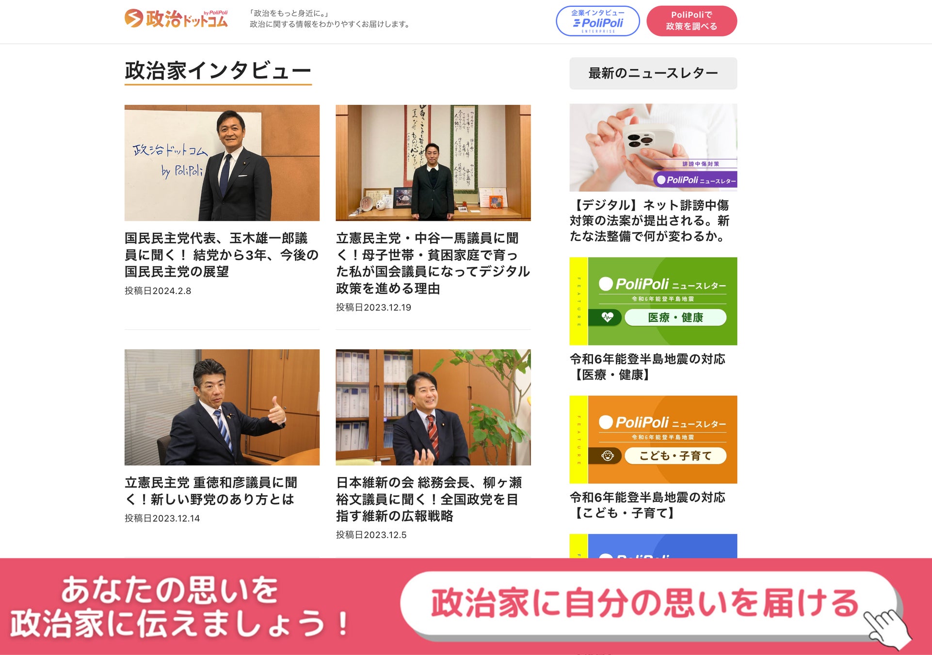 『政治ドットコム』では、政治家インタビュー記事などのコンテンツ充実はもちろんのこと、皆様の気になるテーマにお応えし、『PoliPoli』『PoliPoli Gov』といった各サイトとの連携強化やイベント企画を行ってまいります。