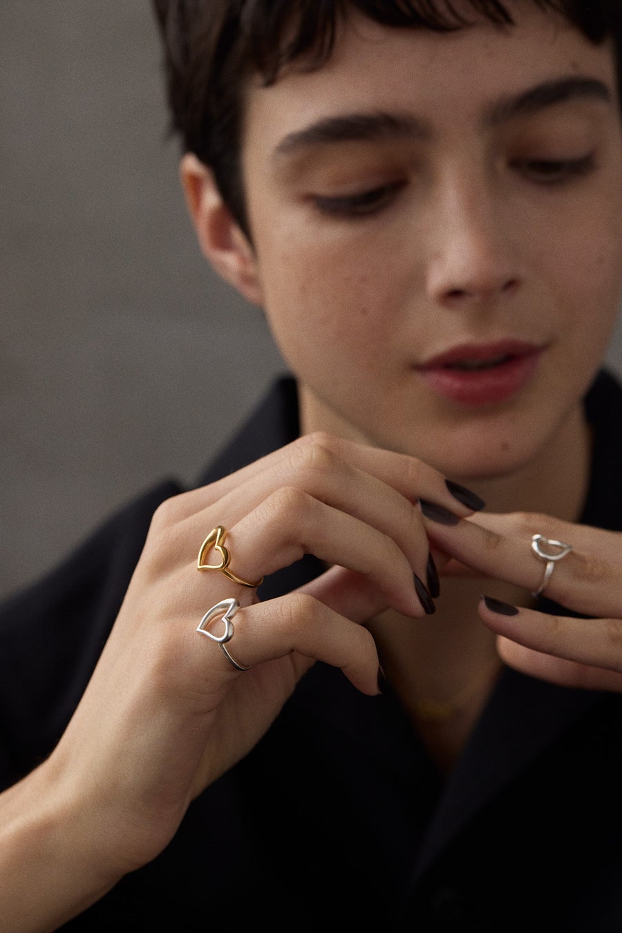 ニュアンスのあるシャープなハートモチーフが手元に抜け感を与えてくれるオープンハートデザインのリングです。好きな指に着用できる3サイズの展開です。