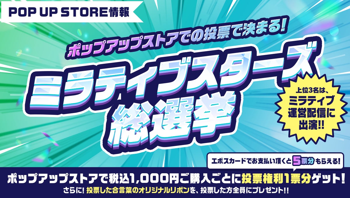 ポップアップストア内にて、ミラティブ公認配信者「ミラティブスターズ」で最高クラスに到達した配信者を対象にした総選挙を開催いたします。ユーザー投票によって、Mirrativで最も人気のあるミラティブスターズ配信者が決定いたします。