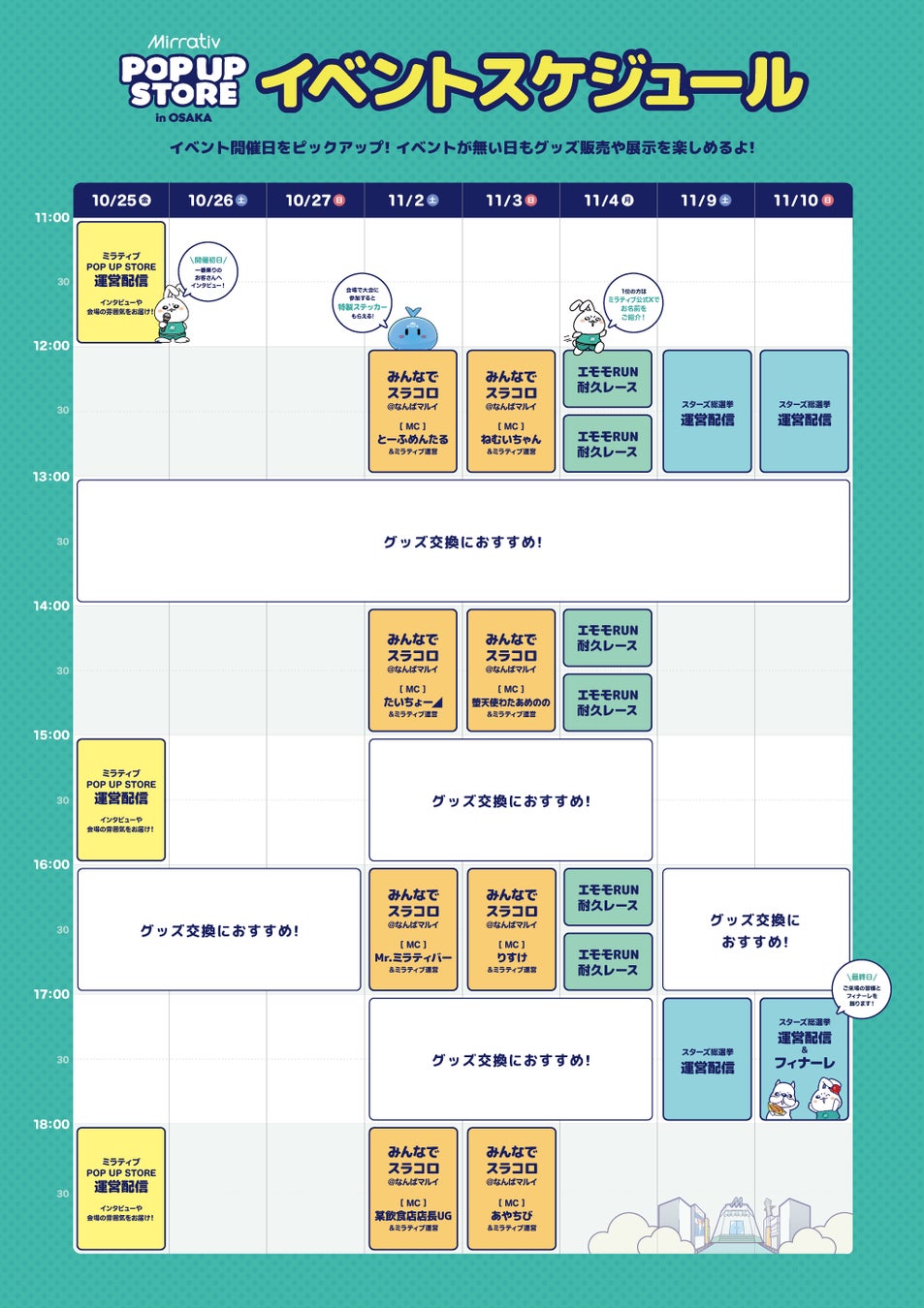 本ポップアップストアでは、ここでしか手に入らないミラティブのオリジナルグッズ、トップ配信者の等身大パネルが登場します。さらにはミラティブスターズ総選挙、ミラティブ内で遊べるライブゲーム「スラポンコロシアム」のモンスター人気投票、メッセージを残せるよせがきコーナー、ミラティブ運営と一緒に遊ぶゲーム大会を用意し、ユーザーの皆さまと一緒につくりあげる、ここだけの特別な空間を提供いたします。