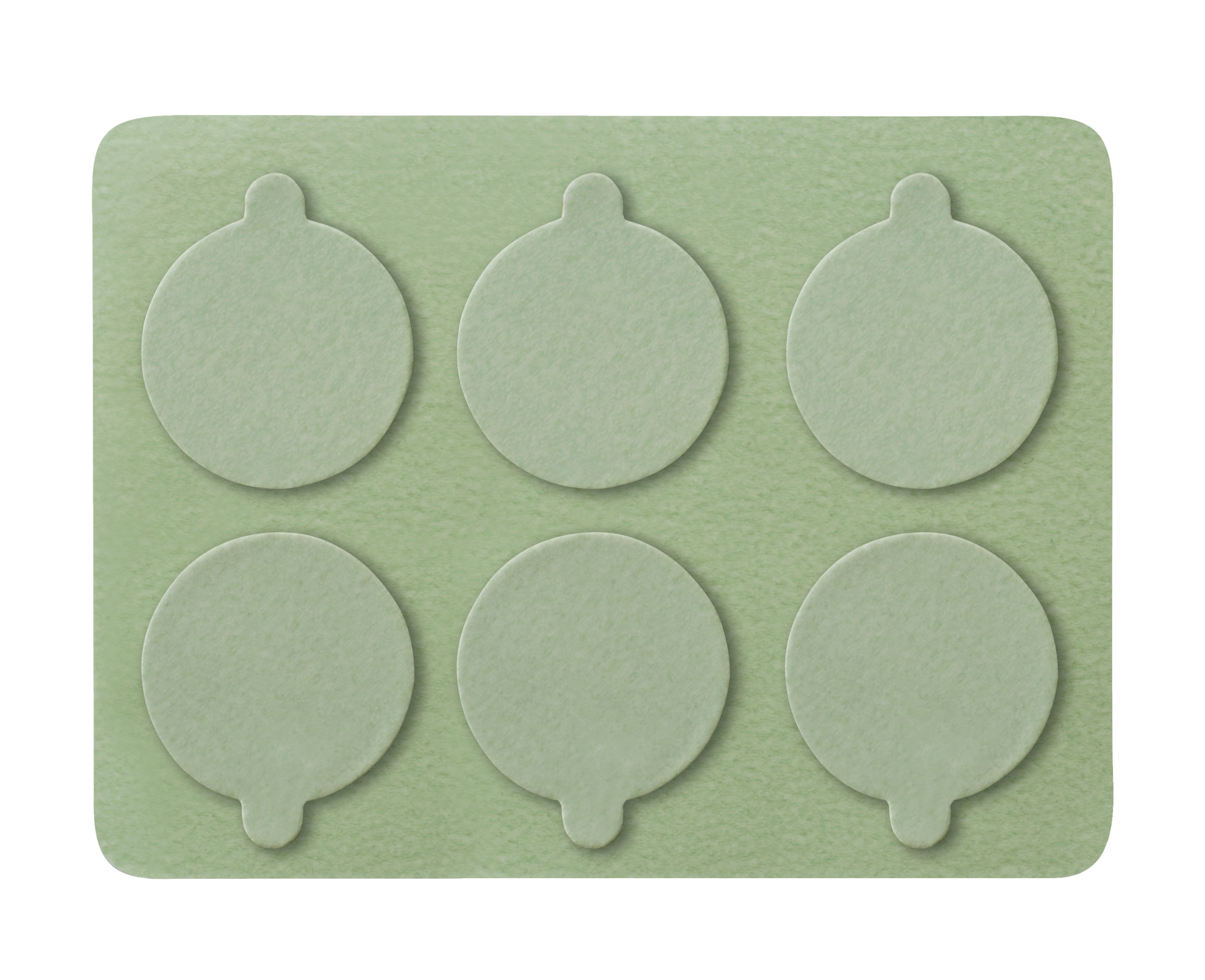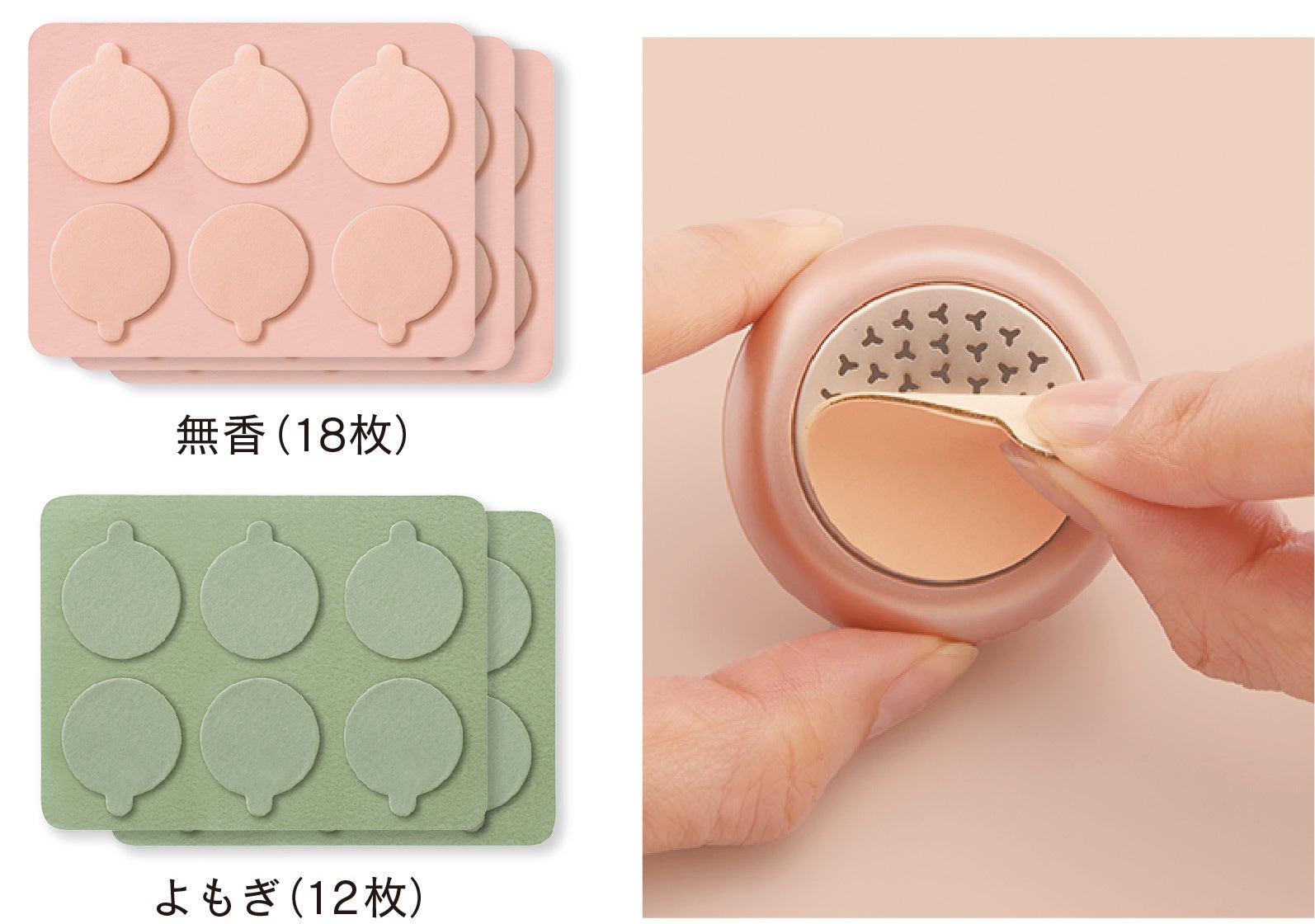 機器本体を体に固定する粘着シールが付属。一般的なお灸は寝た状態で使用しますが、本機では粘着シールで固定することで座った姿勢でも使用できます。粘着シールには、無香タイプとよもぎの香りの2タイプを付属。気分に合わせて使えます。