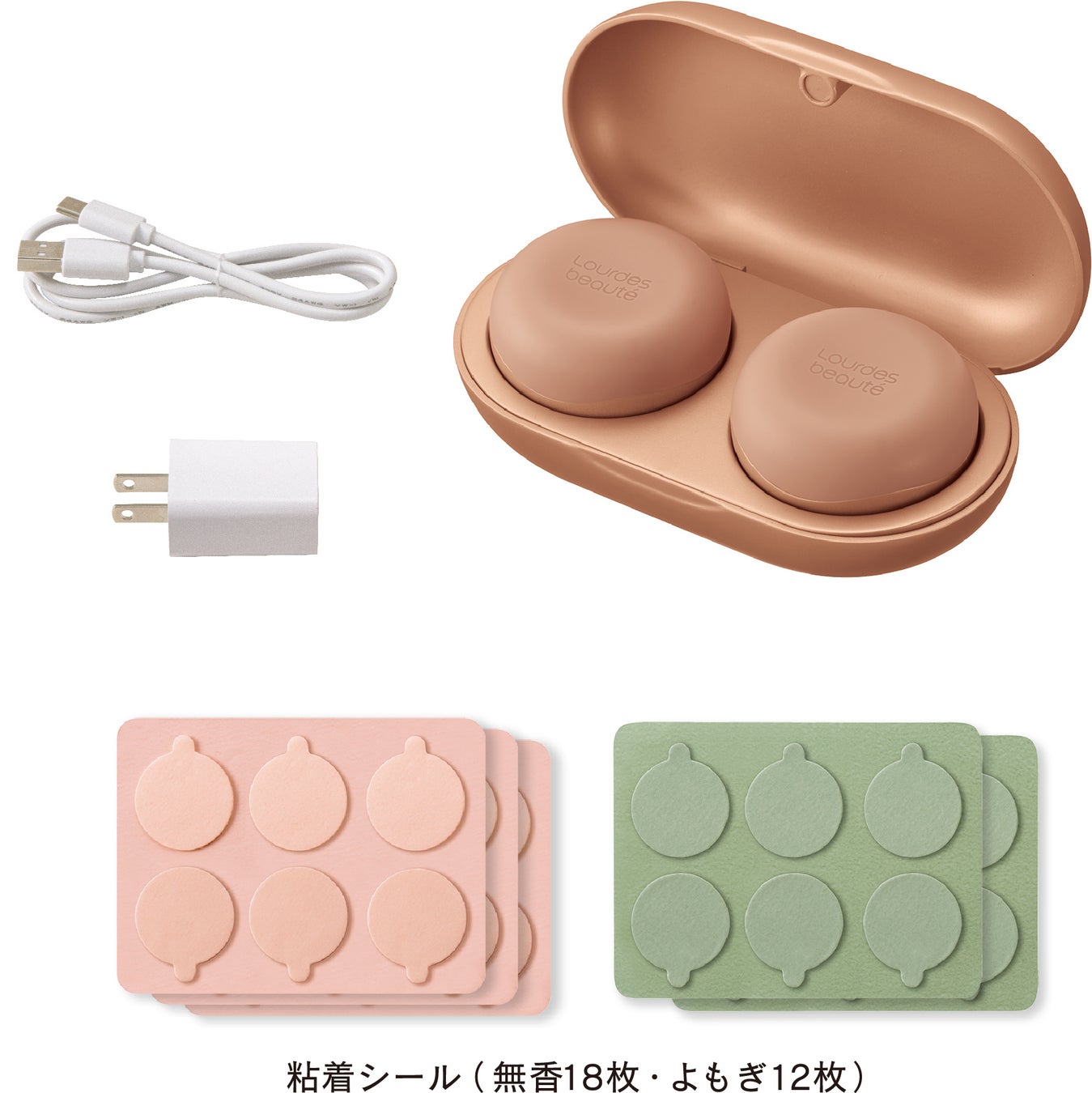 付属品 :充電ケース、ACアダプター、充電ケーブル、粘着シール(無香18枚・よもぎ12枚)