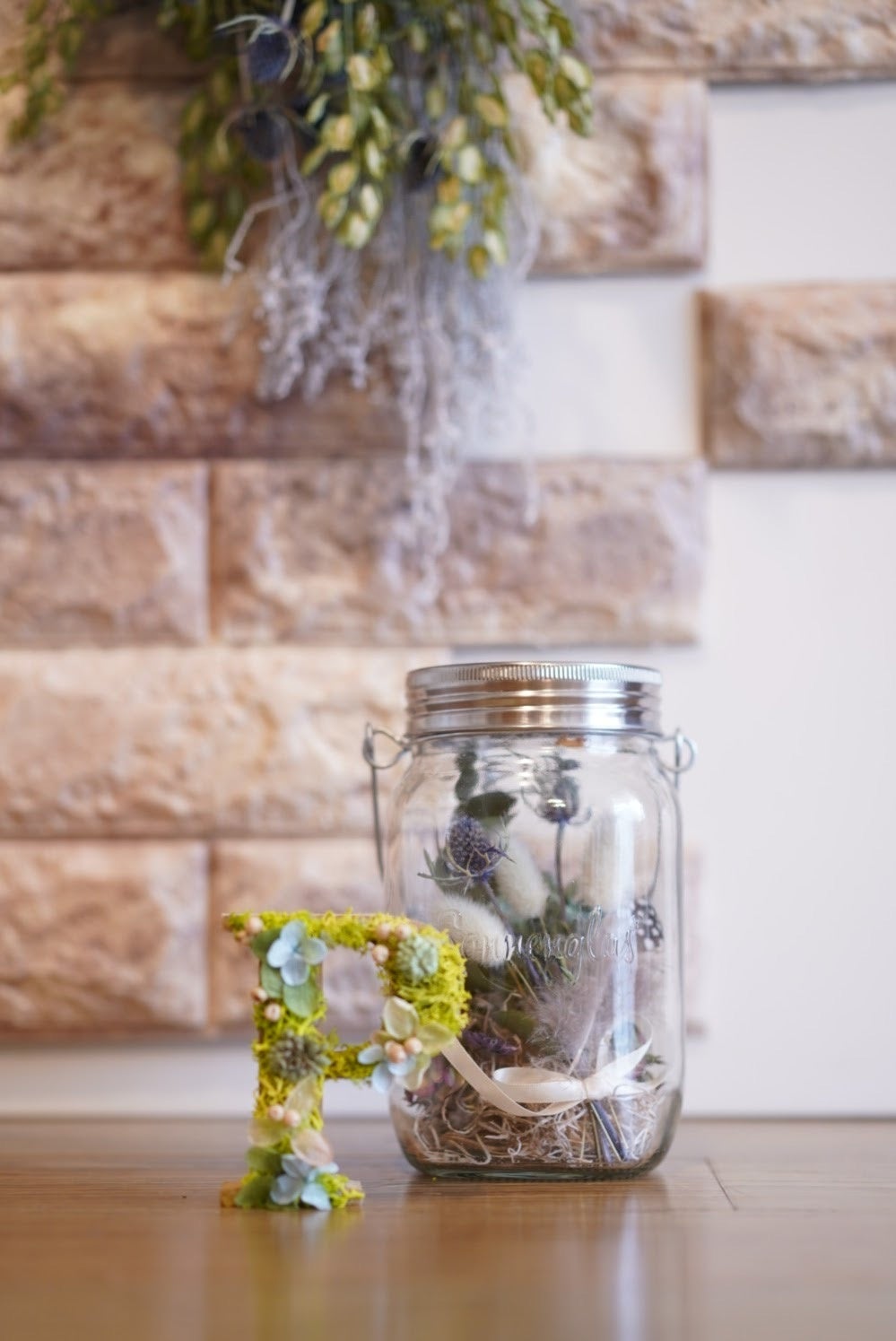 ソネングラスと一緒に作成できる愛犬のイニシャルは、お好みの花材でフラワーアレンジメントをすることで、こちらもインテリアとして活躍すること間違いなしです。多頭飼い主様は、追加でイニシャルを作成することも可能です。(別途追加料金)