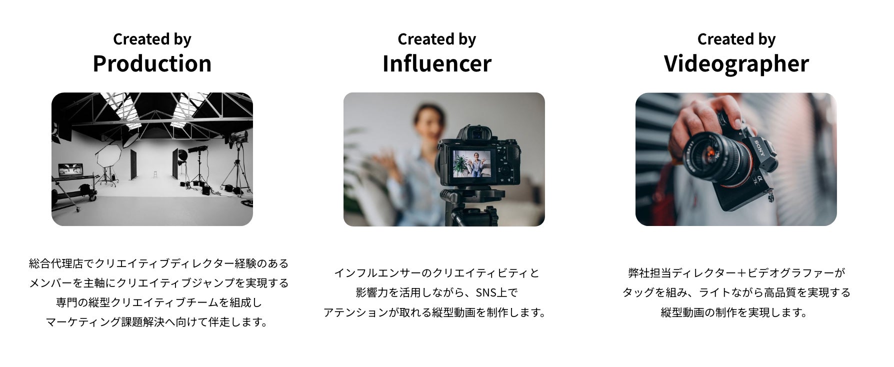SNSマーケティング支援を通じて得られた縦型コンテンツの知見を保有する弊社と、縦型クリエイティブに深い知見を持つクリエイティブディレクターやインフルエンサーのタッグにて、縦型クリエイティブを通じた態度変容効率の最大化を実現します。