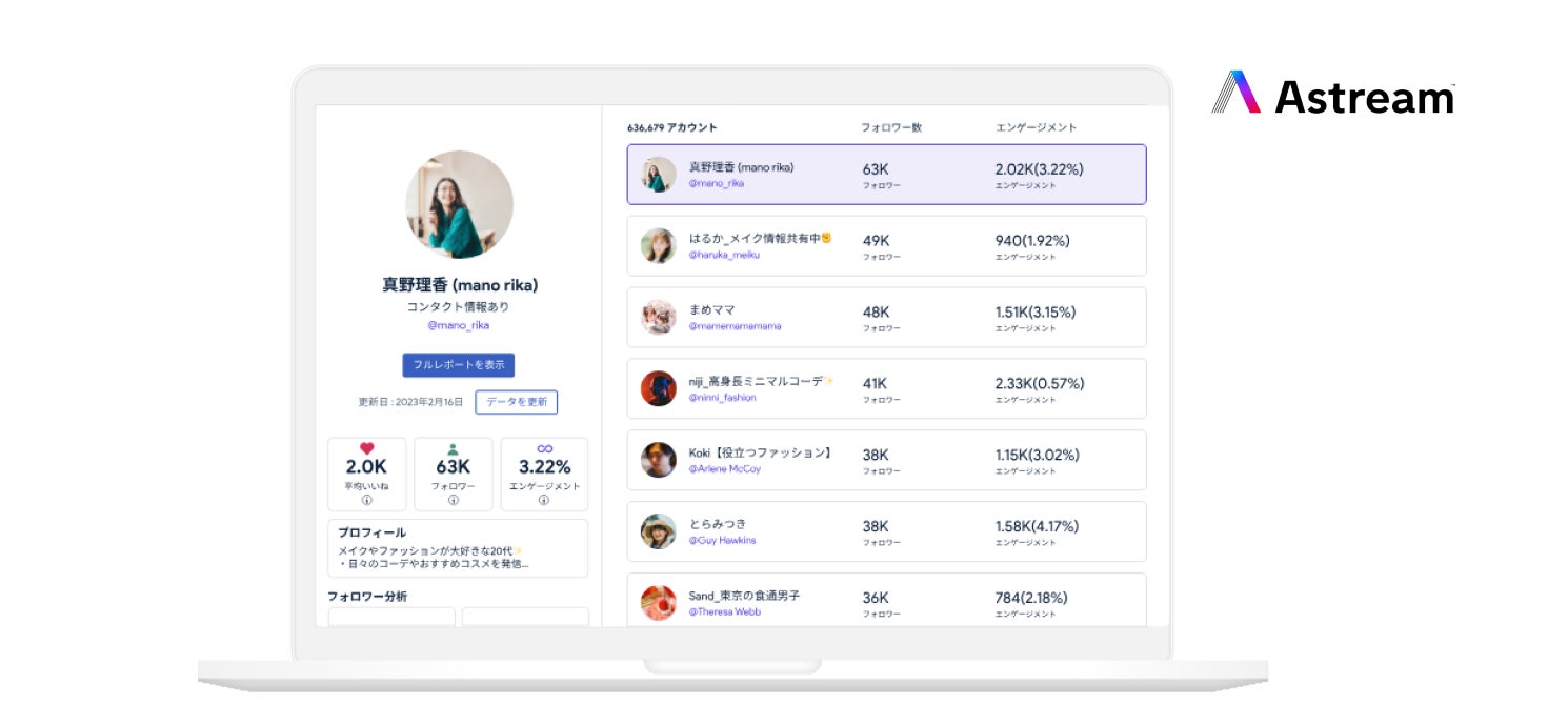 創業以来、キャスティングしたインフルエンサーは57,530人!自社開発の業界No.1データ量、200万アカウントを保有してるインフルエンサーマーケティングツール「Astream」を活用した、”感覚値頼りにならないデータドリブンなアサイン”を得意としています。