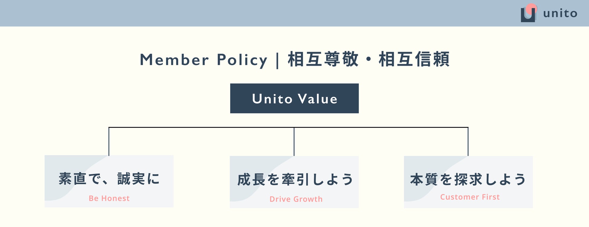 これらの評価の基盤として、Unitoのメンバーポリシーである「相互尊敬・相互信頼」の実践や、行動指針として「素直で、誠実に」「成長を牽引しよう」「本質を探求しよう」という3つのバリューを掲げて、人事部を中心に社内カルチャーを推進しています。これらを大切に実践しながら、日々の事業だけでなくキャリアにおいても成長できる環境の実現を目指しています。