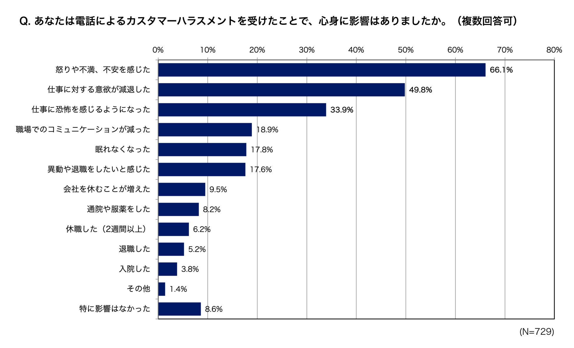 電話によるカスハラを受けたことによる心身への影響は、多い順に「怒りや不満、不安を感じた(66.1%)」「仕事に対する意欲が減退した(49.8%)」「仕事に恐怖を感じるようになった(33.9%)」となりました。