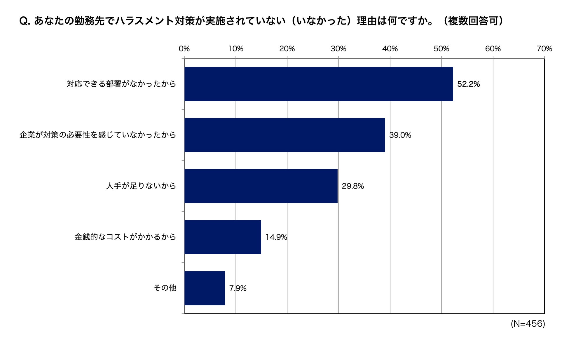 勤務先でハラスメント対策が導入されていなかった理由は多い順に「対応できる部署がなかったから(52.2%)」「企業が対策の必要性を感じていなかったから(39.0%)」「人手が足りないから(29.8%)」でした。企業において、ハラスメント対策を行うための人的コストが不足している状況や、従業員の求めるハラスメント対策のニーズに対応できていない可能性などが考えられます。
