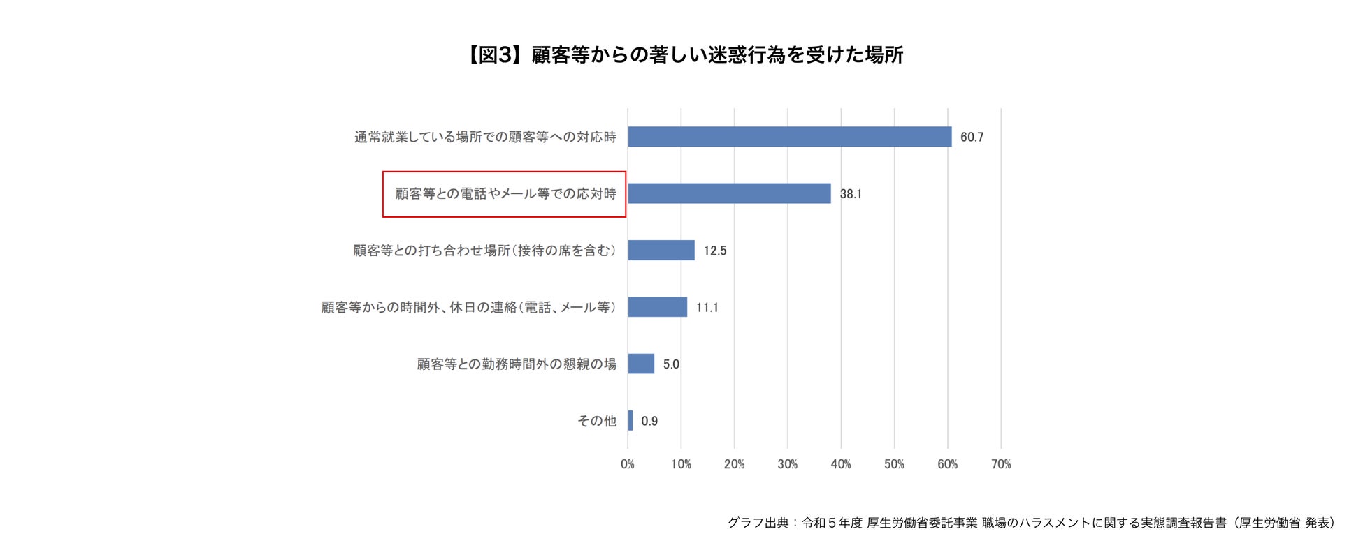 厚生労働省の調査によると、カスハラを受けた場所としては「通常就業している場所での顧客等への対応時(60.7%)」に次いで、「顧客等との電話やメール等での応対時(38.1%)」が多くなっています(図3)。特に電話は、顧客が顔や名前を明かしたり、窓口に赴いたりする必要がないといった側面から、カスハラが起こりやすいと考えられます。通話内容の記録などを行っていない場合は、顧客と担当者のやり取りがブラックボックス化しやすく、カスハラの被害への対応が困難になる場合があります。
