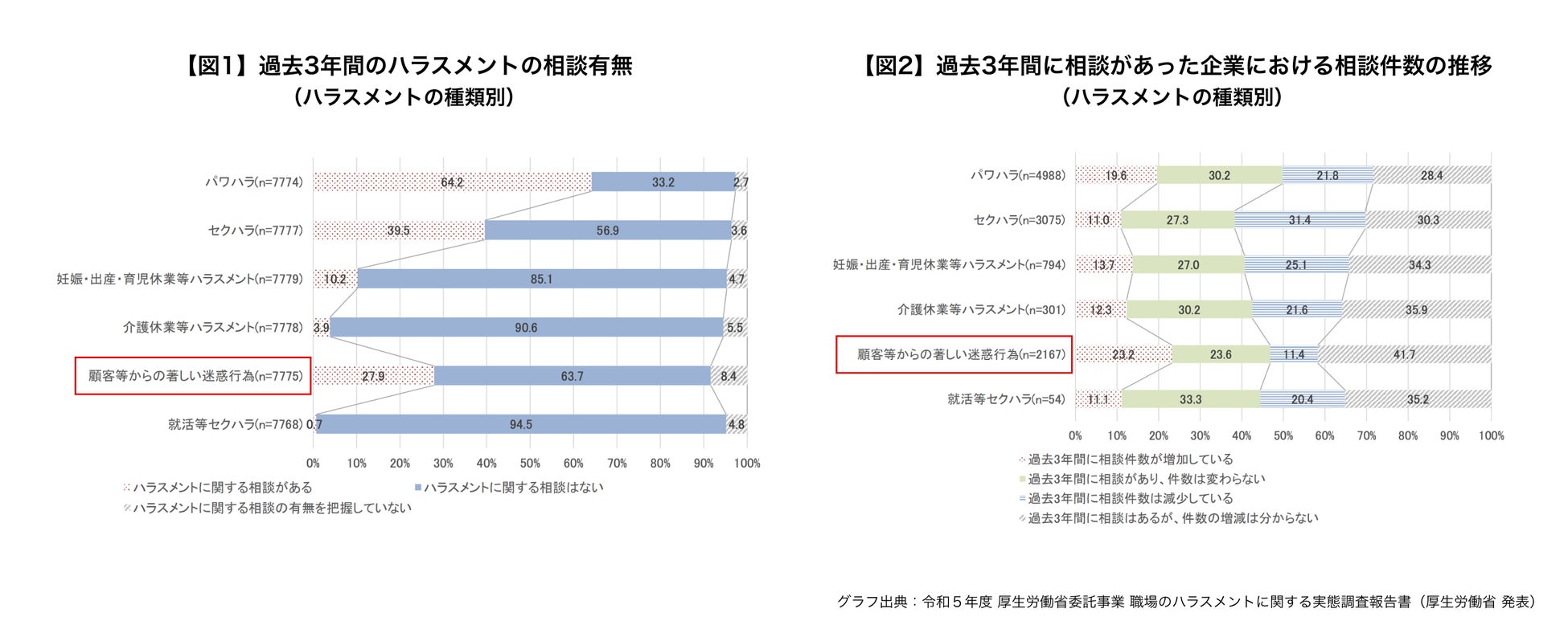 厚生労働省が発表した、令和5年度の「職場のハラスメントに関する実態調査報告書」によると、過去3年間で企業に相談があったハラスメントのうち、パワハラ、セクハラに次ぎ、カスハラは3番目に多い27.9%でした(図1)。また、過去3年間に相談件数が増加していると回答されたハラスメントはカスハラが最多(図2)で、近年企業においてカスハラ被害が表面化しているとみられます。