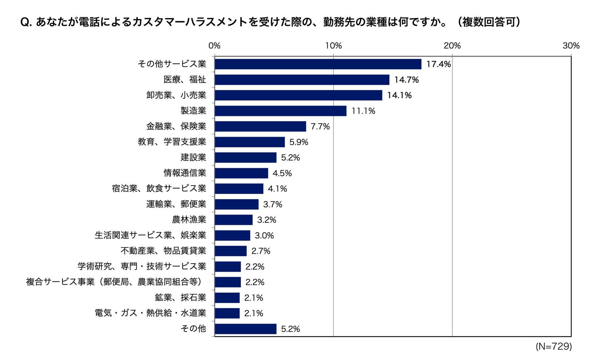 電話によるカスハラを受けた際の勤務先の業種は、多い順に「その他サービス業(17.4%)」「医療、福祉(14.7%)」「卸売業、小売業(14.1%)」でした。接客など、主に個人顧客とのやり取りが多いと考えられる業種で、電話によるカスハラを受けたと回答した人が目立ちました。
