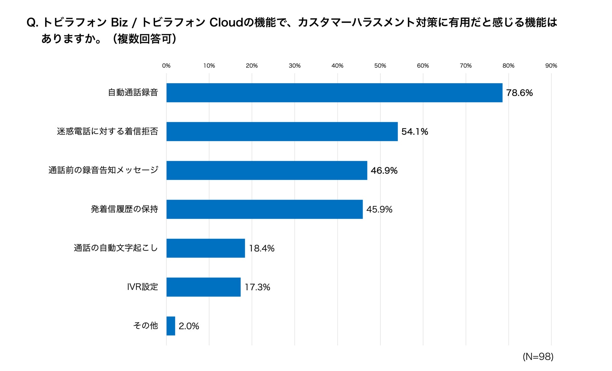 また、「トビラフォン Biz」および「トビラフォン Cloud」のユーザーがカスハラ対策に有用だと感じている機能の1位は「自動通話録音(78.6%)」でした。そのほか、迷惑電話の着信拒否機能や通話前の録音告知メッセージ、発着信履歴の保持など、当サービスが搭載する様々な機能がカスハラ対策に活用されています。