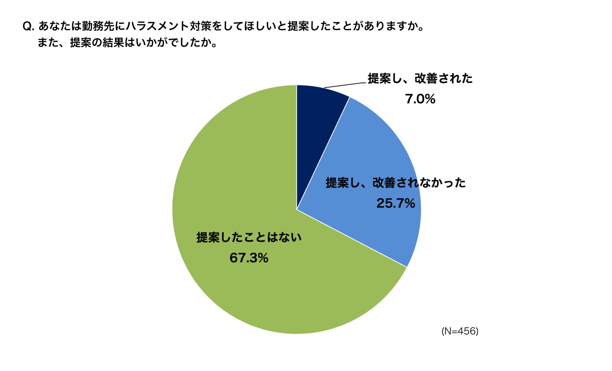 勤務先でハラスメント対策が行われていなかったと回答した人に「勤務先にハラスメント対策をしてほしいと提案したことがあるか」と質問したところ、「提案したことはない」が7割近くと最も多い回答となりました。「提案し、改善された」はわずか7.0%で、「提案し、改善されなかった」ケースが25.7%となりました。「提案した」と回答した人のうち、「改善されなかった」と回答した人が8割近くに及び、従業員が実際に声を上げても改善されづらい状況にあると考えられます。