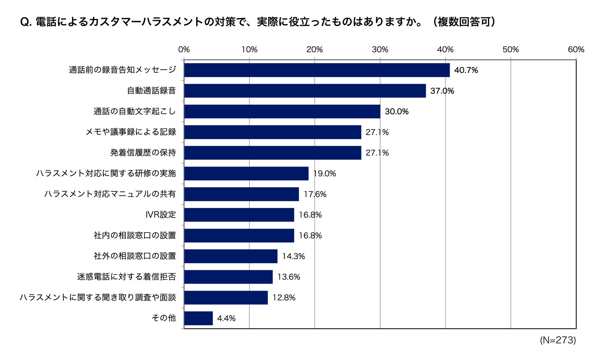 また、「自動通話録音(37.0%)」「通話の自動文字起こし(30.0%)」が役立ったという回答も多くあがりました。録音や文字起こしによる記録も、通話内容の振り返り、言った・言わないのトラブル防止、カスハラの被害状況の報告などに役立つと考えられます。