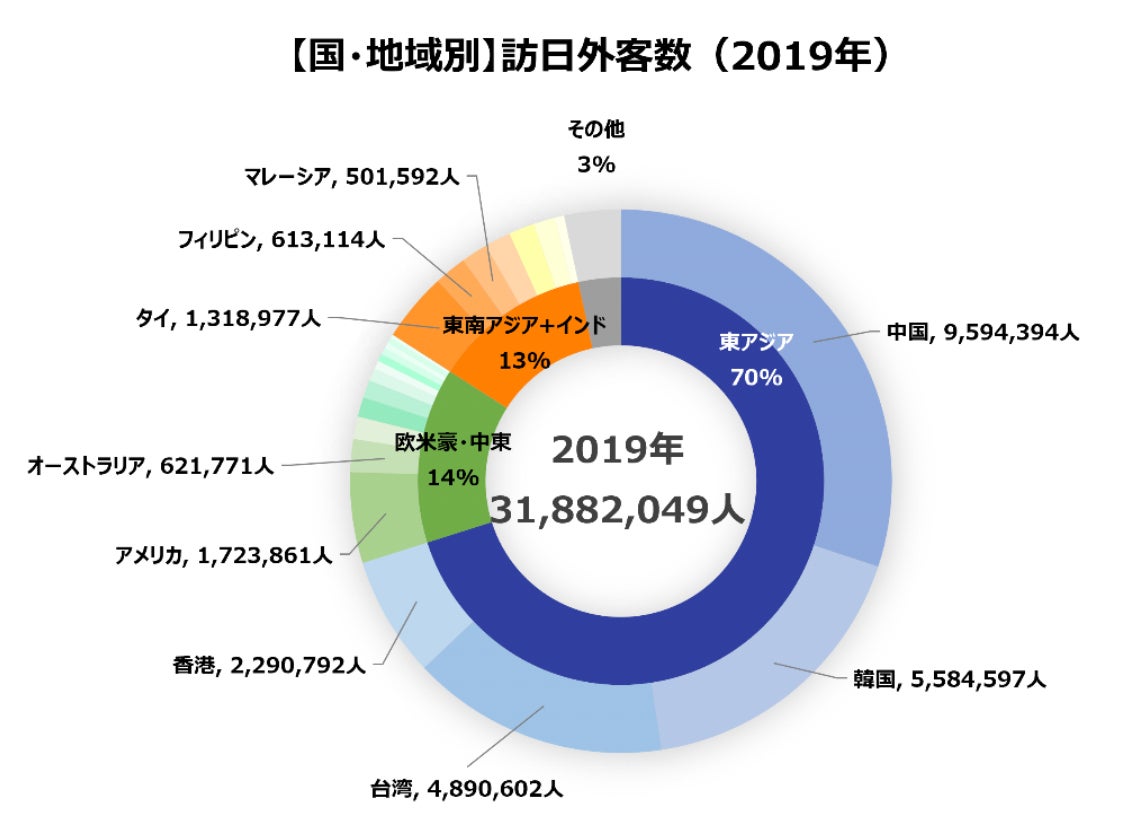 国・地域別では、1位が韓国881万人(2019年対比+323万人、+57.9%)、2位が中国698万人(2019年対比▲261万人、▲27.2%)、3位が台湾604万人(2019年対比+115万人、+23.6%)となりました。