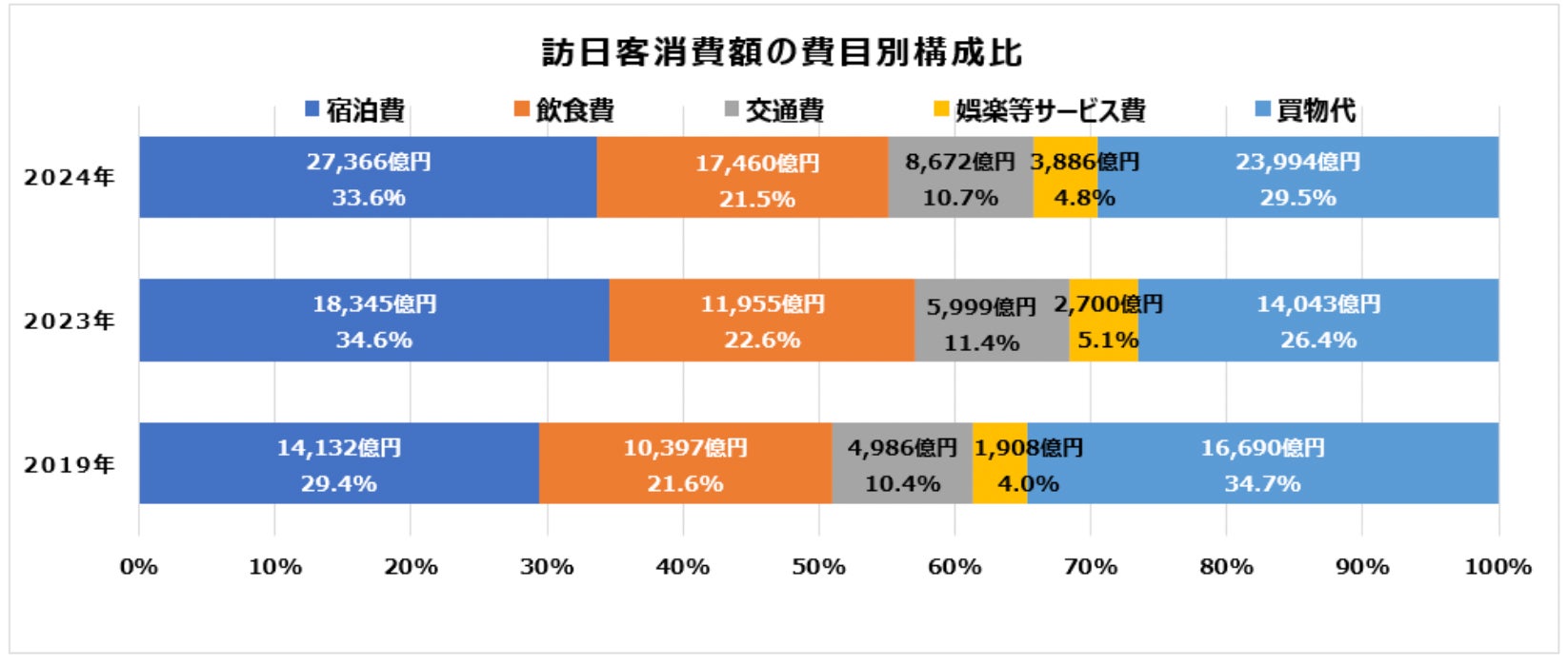 2024年の訪日客旅行消費額は約8.1兆円(2019年対比+69.1%)となり、過去最高額を更新しました。円安により国内の商品やサービスの魅力が高まり、訪日客の消費意欲が旺盛になっています。費目別では宿泊費が約2.7兆円(2019年対比+93.6%、構成比29.4%→33.6%)と最も多く、買い物は約