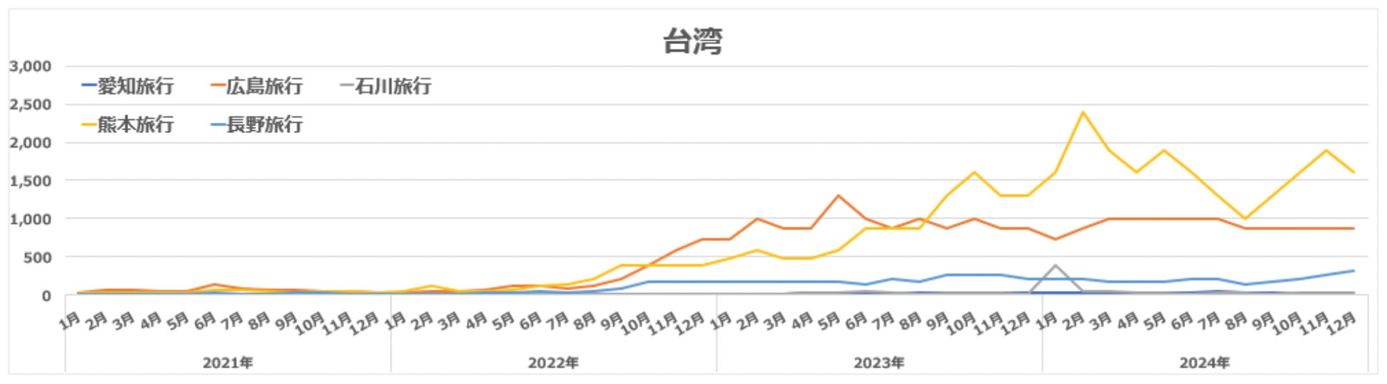 次に台湾ですが、2023年4月より、熊本県ご当地ガイドツアー『くまモンの歩き方』がリリースされたことや、2024年2月に台湾積体電路製造(TSMC)が熊本に進出したこと、また2023年1月より広島―台北便が再開し、同年5月に開催されたG7広島サミット効果で広島への訪日客が復活したことなどが要因と考えられます。