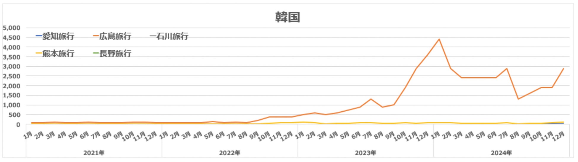 以下は、調査した8ヶ国・地域※の「愛知旅行」、「広島旅行」、「石川旅行」、「熊本旅行」、「長野旅行」の検索数の合計値をまとめたものです。これら5県は、2024年10~11月の都道府県別宿泊者数トップ20より、2019年と比較して東京・大阪・京都・北海道など特に人気の観光地以外で宿泊者数が多かった県です。日本政府が添乗員の同行を伴わないパッケージツアーの受け入れを開始した2022年8月以降、検索数が伸びていることが分かります。