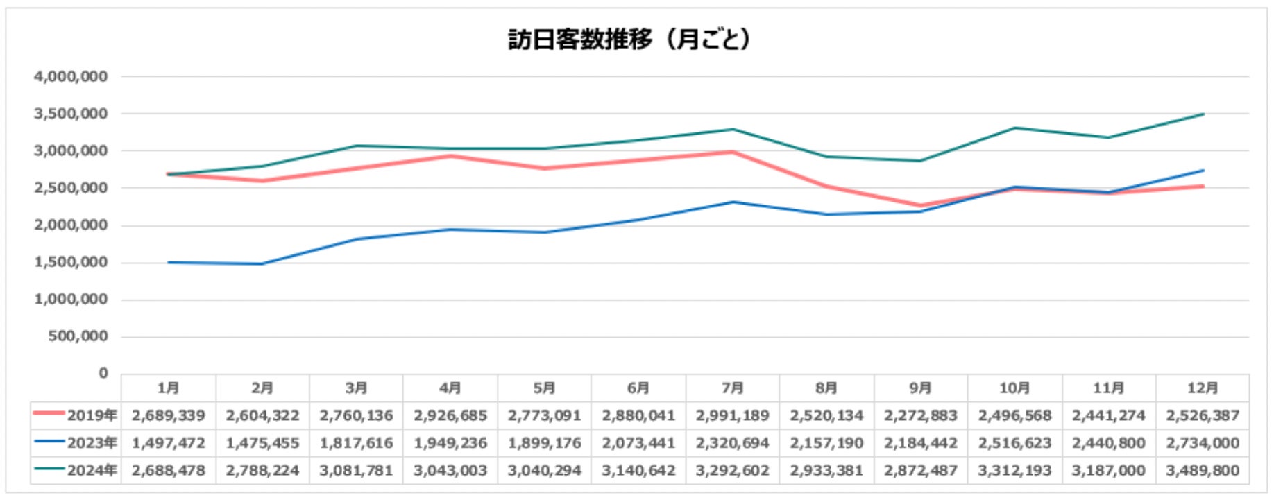 2024年の訪日外国人客(以下、訪日客)数*1は約3,686万人に達し、コロナ禍前の2019年を約500万人上回り、年間の過去最高記録を更新しました。さらに月別では、1月を除いたすべての月で2019年を上回っただけなく、12月においては単月で過去最高となりました。