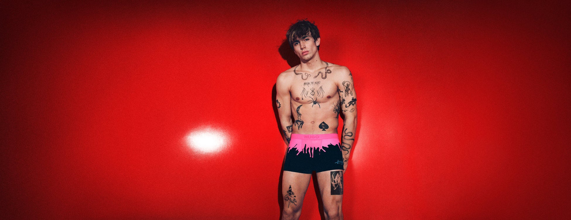 このキャンペーンに共通しているHUGOのシグネチャーカラーである赤は、すべてのクリエイティブ・コンテンツに登場し、HUGOのDNAが生々しい反抗心と力強い独創性にあることを視聴者に想起させます。