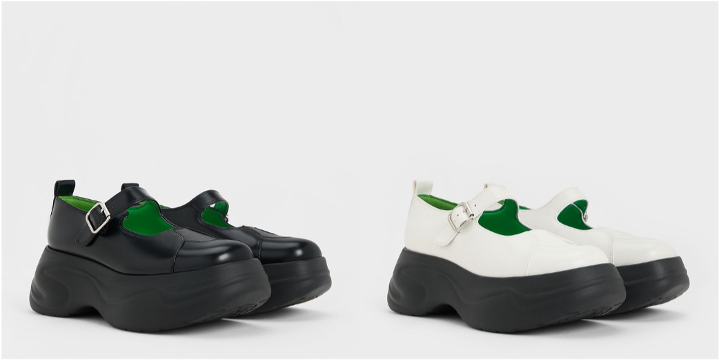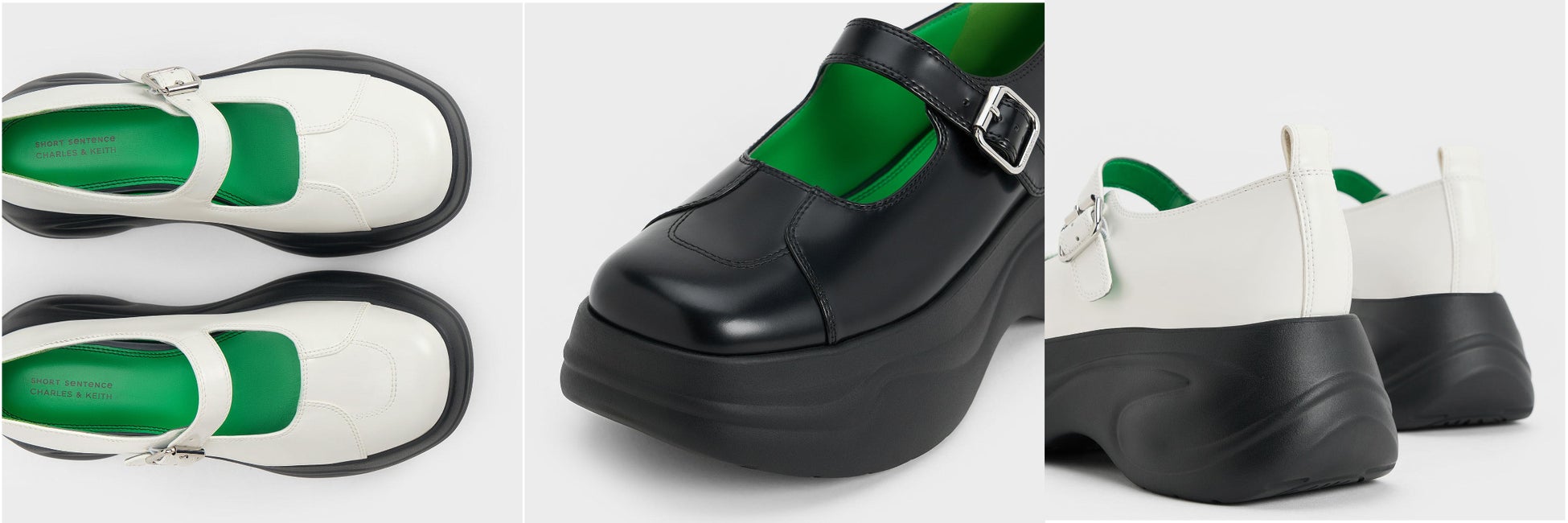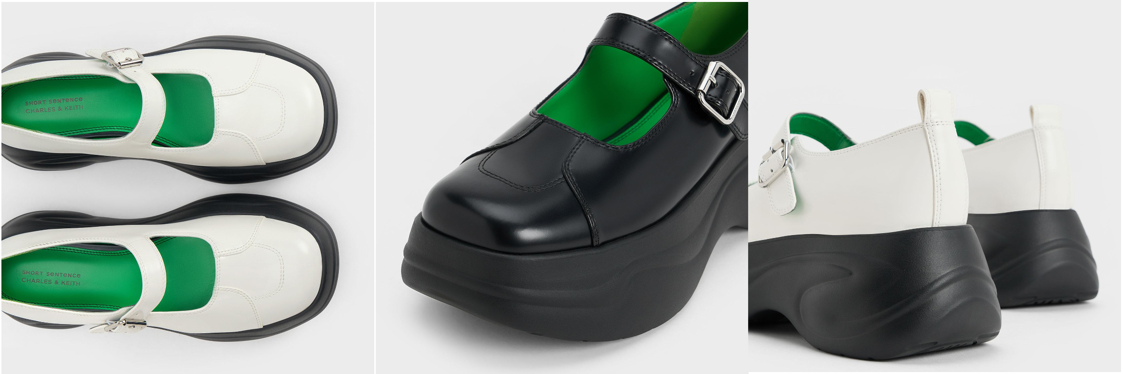 ブラックとホワイトの「カーブ プラットフォームメリージェーン」は、ショートセンテンスのクラシックな靴の構造を反映し、マットな質感のリサイクルフェイクレザーを使用しています。
