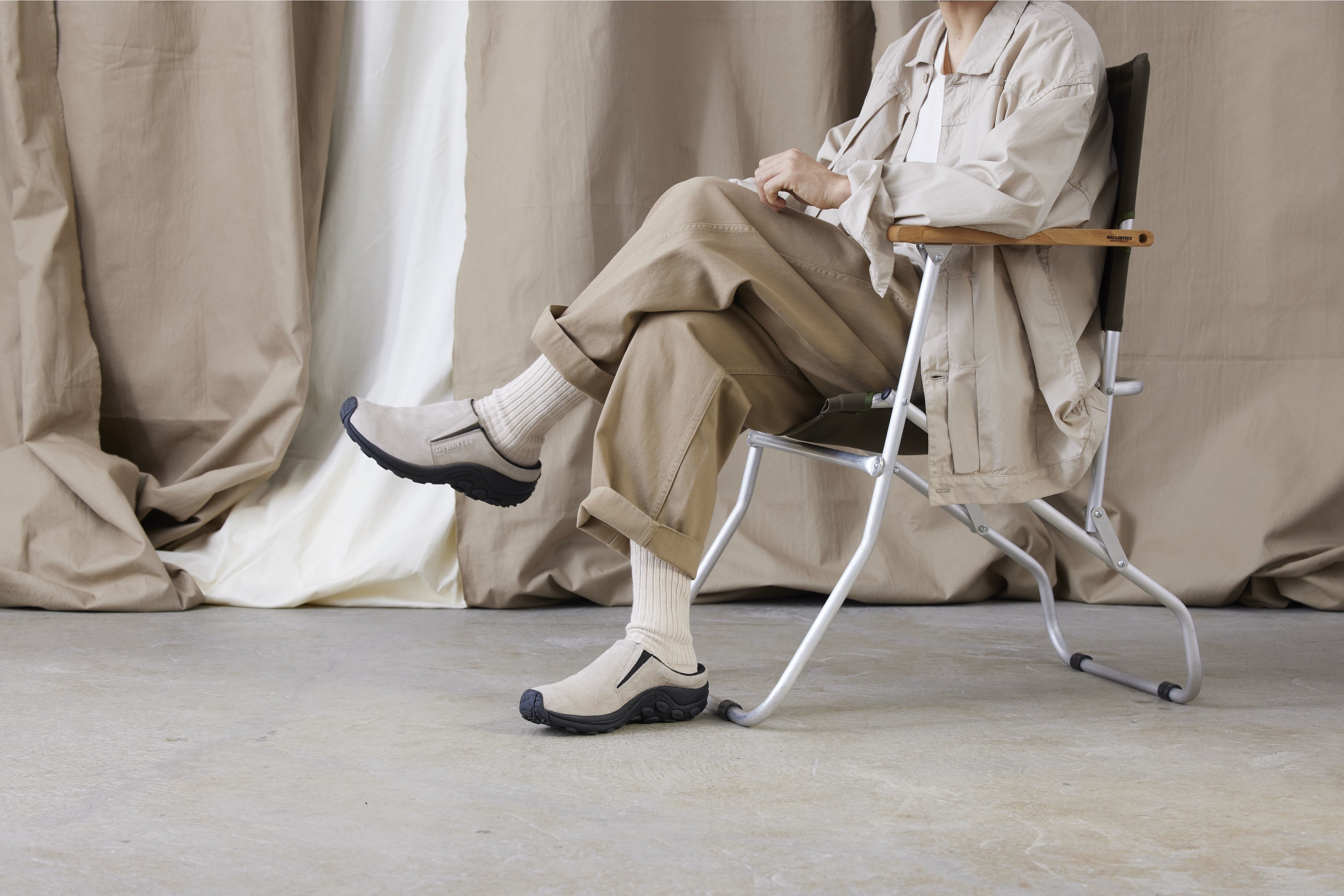 当シューズは、着脱が容易な「JUNGLE MOC」のシューズ特性を、更にスムーズ且つ快適にする“EASY ON/OFF”なスライドタイプであることに加え、アッパーの側面にあるゴアと踵をしっかりホールドする構造により、着脱の快適さだけでなく歩行時の脱げにくさやフィット感を実現します。また、50%リサイクルEVAフォームのインソールと軽量EVAフォームミッドソールが歩行時の安定性とクッション性を共にサポートします。更に、メレル独自開発の「MERRELL AIR CUSHION」を搭載したことで、着地安定性や優れた衝撃吸収性を発揮します。アウトドアシーンでも頼れるトラクションと堅固なグリップ力を魅せてくれるラバーアウトソールも必見です。