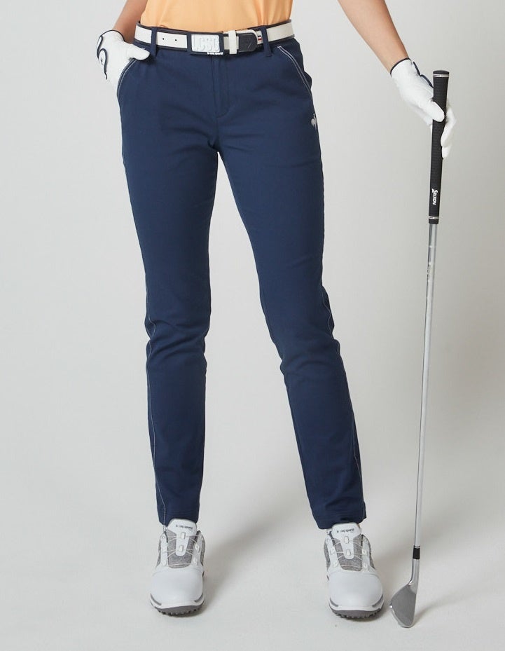 サイドのステッチを生地と違う色にすることで脚を細く長く見せます。