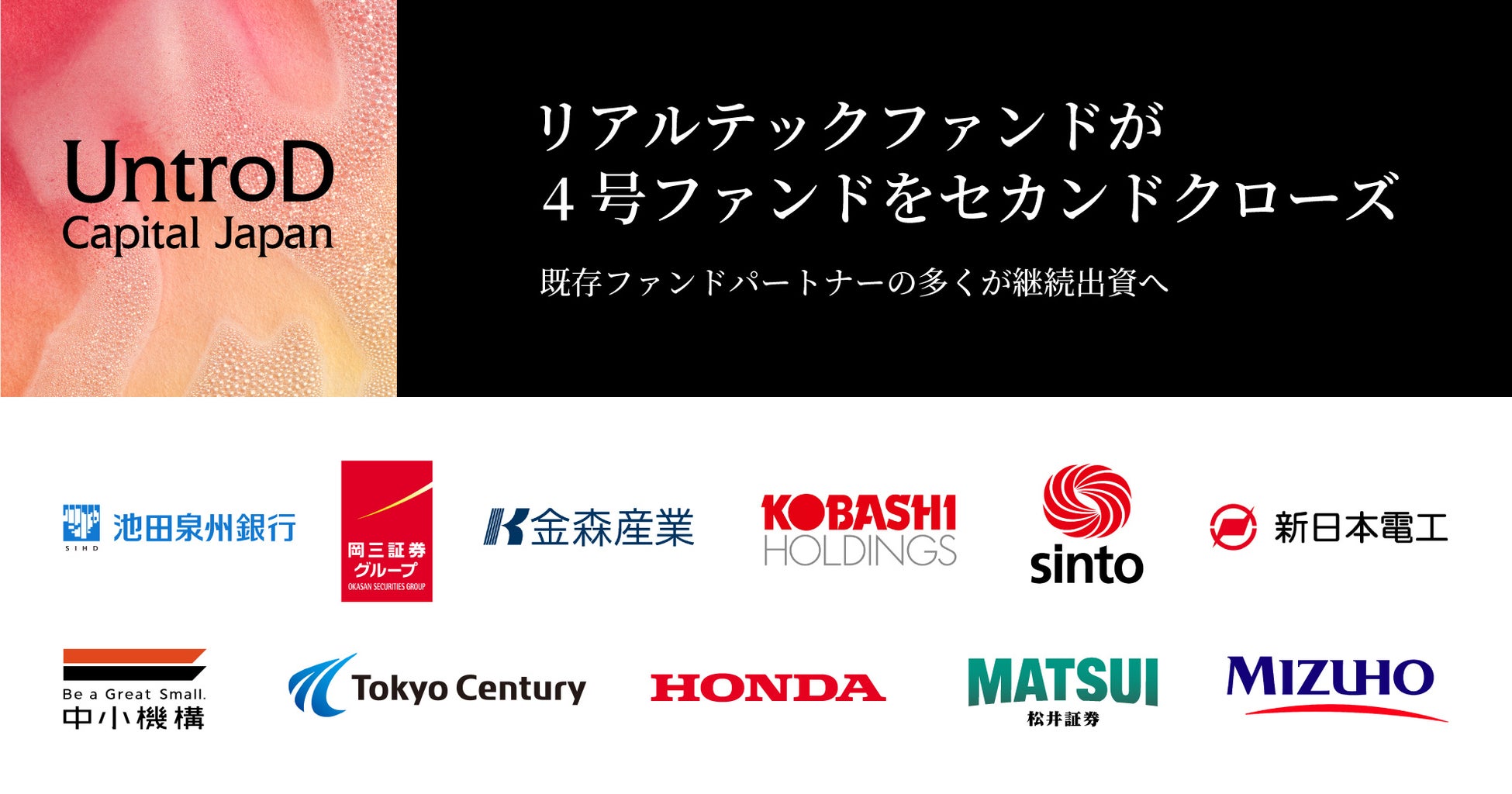 UntroD Capital Japan株式会社※1(アントロッドキャピタルジャパン、代表取締役社長:永田暁彦、以下「当社」)は、シード・アーリーステージのディープテック・スタートアップ支援に特化したファンドとして国内4本目となる「リアルテックファンド4号投資事業有限責任組合(以下、RTF4号)」のセカンドクローズを完了いたしました。今回のクローズにおいて既存ファンドのパートナー(組合員)から独立行政法人 中小企業基盤整備機構、東京センチュリー株式会社が参画したことで、RTF4号パートナーの半数以上が既存ファンドからの継続出資となります。また、愛知県に本社を置く大手鋳造設備メーカーの新東工業株式会社が新たにパートナー参画いたしました。