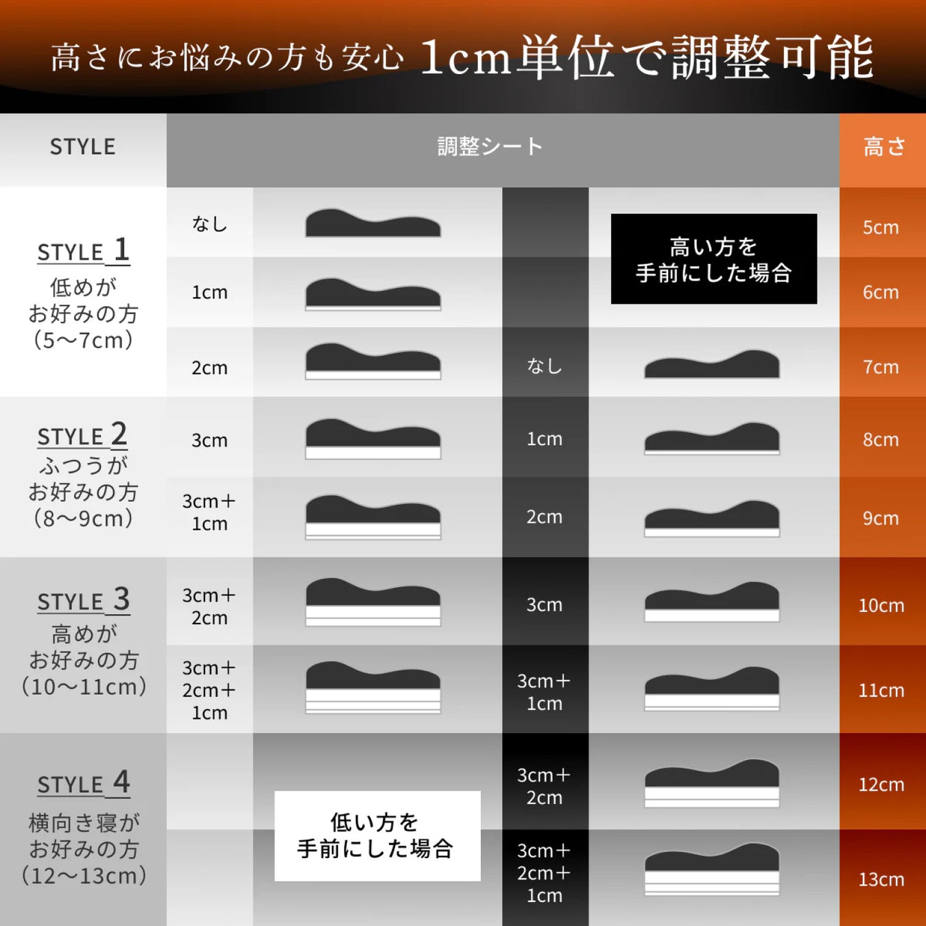 1cm/2cm/3cmと厚み違いの3枚の高さ調整シートで5cm~13cmまで、1cm単位で9段階の高さ調整が可能に。オーダーメイドの枕のように、きめ細やかな調整であなたにぴったり合う高さが きっと見つかります。枕は高さと頸椎を支えるカーブが違う両側仕様となっており、お好みでどちらかお選びいただけます。高さがあるので横向き寝の方にもお勧めです。