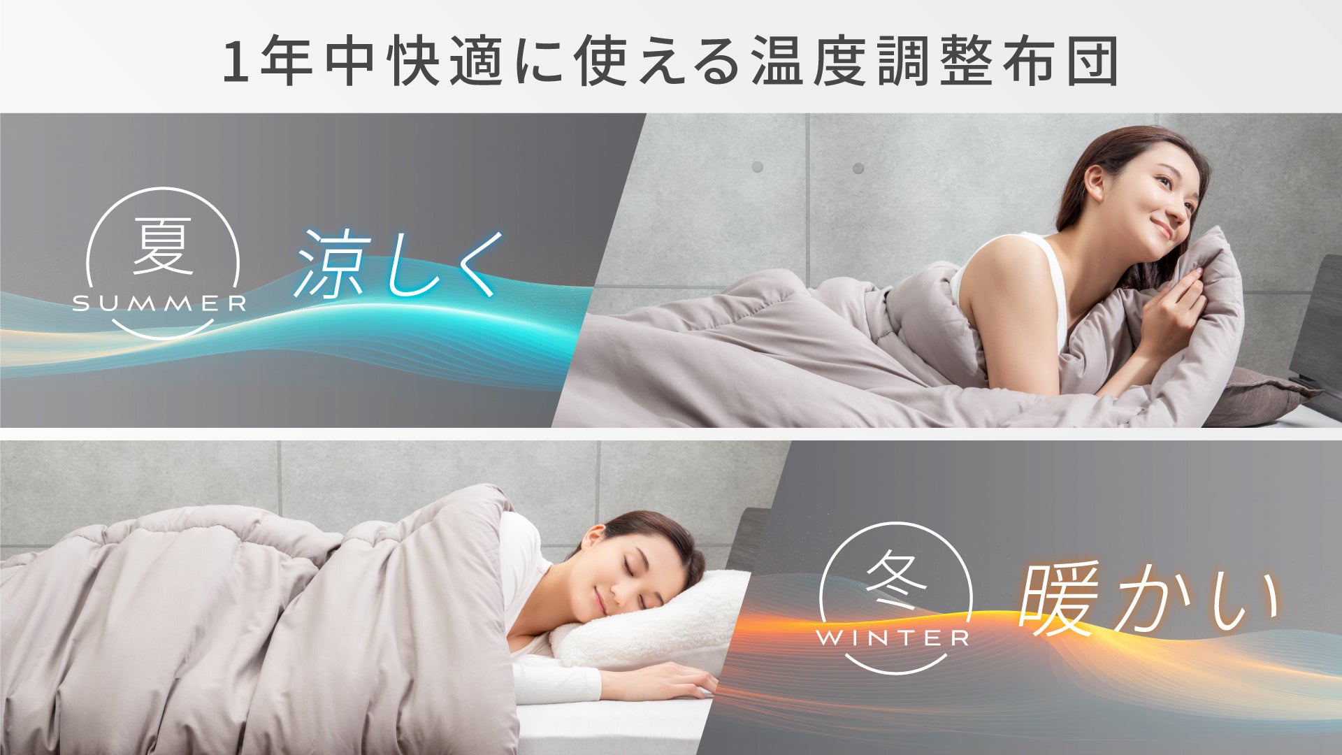 「日本の夏はあつく、冬は寒い」温度変化の激しさから、寝具選びを難しいと感じている方のお悩みに寄り添いました。特殊なマイクロカプセルを含む中綿を使用し、寝具内の温度を一定に保つように温度調整します。今まで夏用と冬用を2枚用意していた方に朗報です。もう〝寝具選び“は必要ありません。夏も、冬も、これ1枚で1年中使えます。
