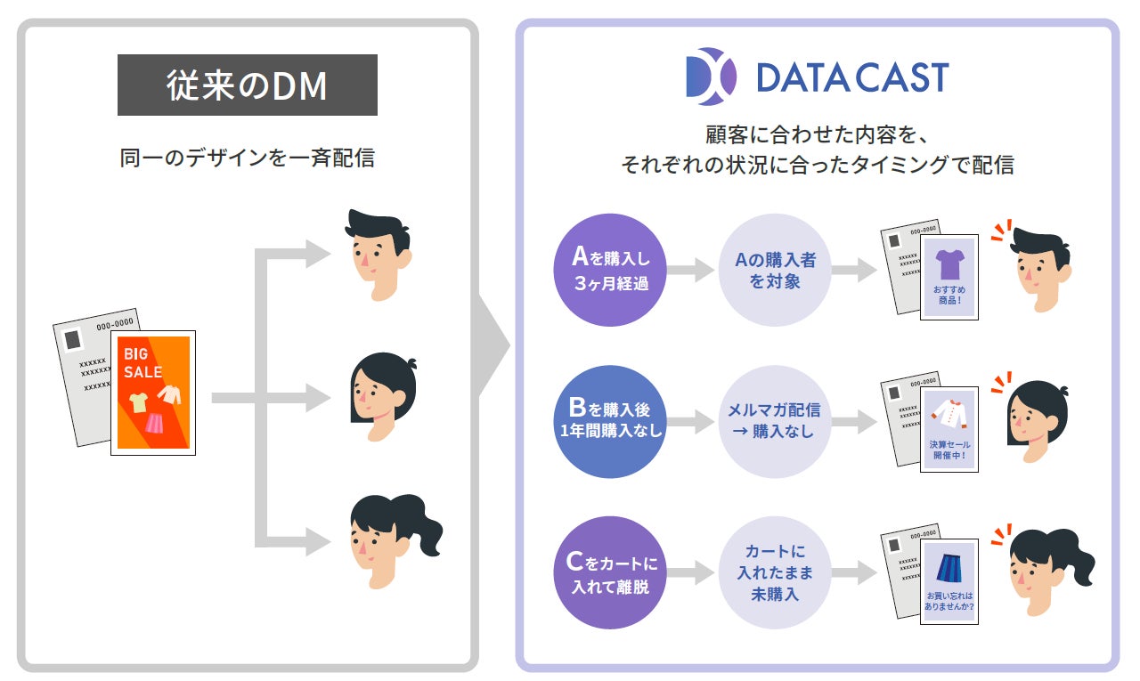 CRMツール「DATA CAST(データ キャスト)」、商品レコメンドやカゴ落ち商品などを顧客ごとに表示分けできるDM自動印刷・自動発送機能をリリースしました