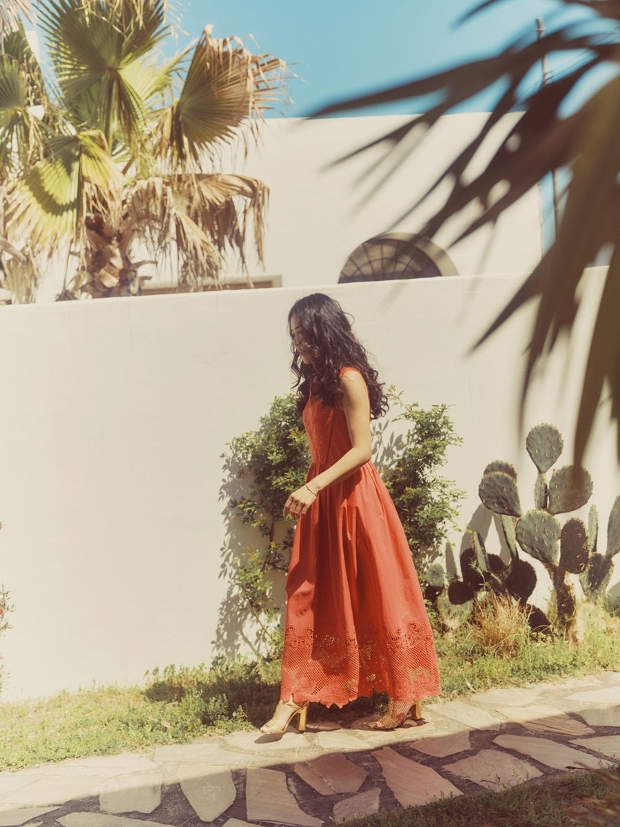 この柄と色のトーンを見た時に真っ先に"赤と着たい!"と思いました。 プールサイドやビーチ、ホテルのプールサイドでランチする時など、着心地のよいラフさがちょっと綺麗に仕上げたい時にピッタリ。
