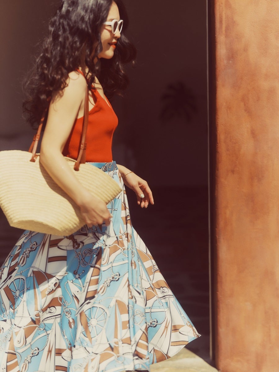 シンプルなトップスと合わせるだけでドラマチックに映るようなたっぷりとしたフレアとシワになりにくい素材も旅にはおすすめです。印象的な柄のものが一つあるだけでコーディネートが簡単に組めるから、柄のボトムスは旅にはあると便利です。