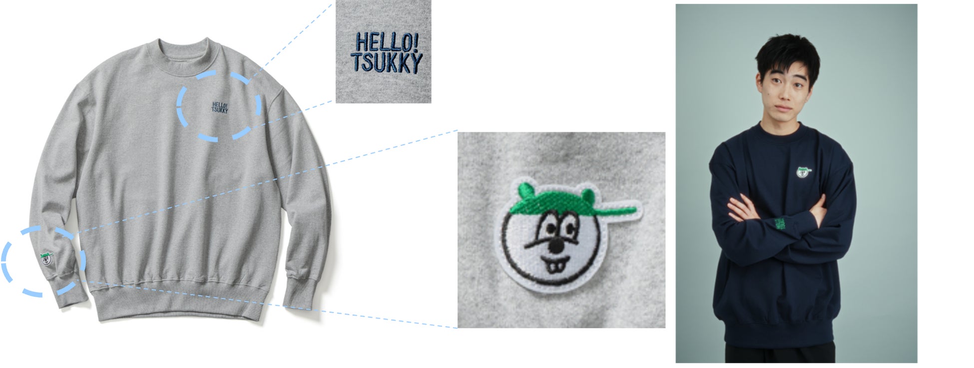 “ツッキーのワッペンと「HELLO! TSUKKY」の刺繍を胸と腕に。 ネイビーと杢グレーで、雰囲気を変えるためあえて、逆に配置したよ。”