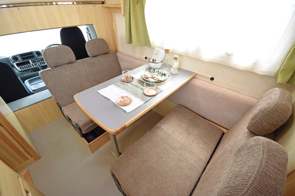 配車するキャンピングカーには、エンジンをかけなくても動作する家庭用エアコンやヒーター、ベッド、テーブル、シンク、冷蔵庫などを備え付けているのでホテルと遜色ない快適な宿泊ができます。