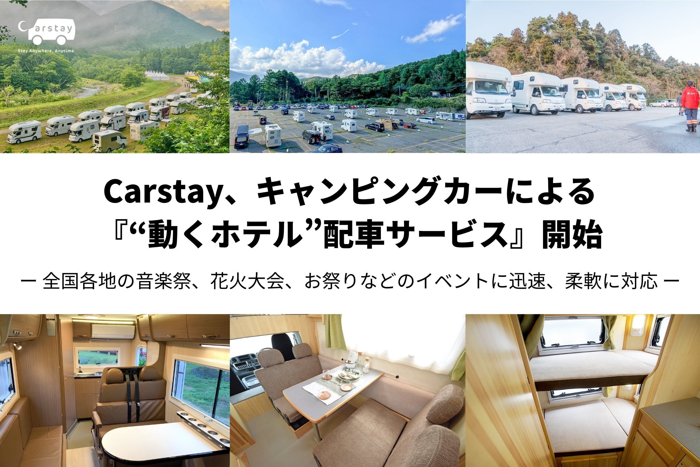 Carstayには現在、全国各地に約500台のキャンピングカーなど車中泊仕様の車両が登録されおり、場所問わず各地の会場へとキャンピングカーを配車することが可能で、それら強みを活かし、地方の人口減少や二次交通、宿泊施設不足などの課題がありつつも、地方活性化に向けて取り組む現場や、そこでのイベント向けに、「“動くホテル”配車サービス」が課題解決につながると考え、今回、本サービスを本格的に開始しました。