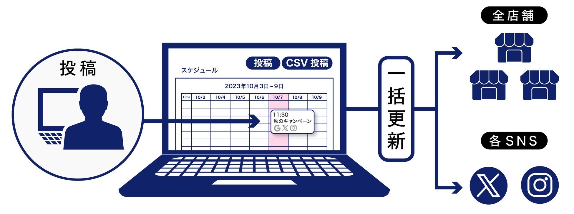 複数メディアおよび複数アカウントへの投稿を一括管理でき、情報の一元性の担保や業務効率化を実現します。