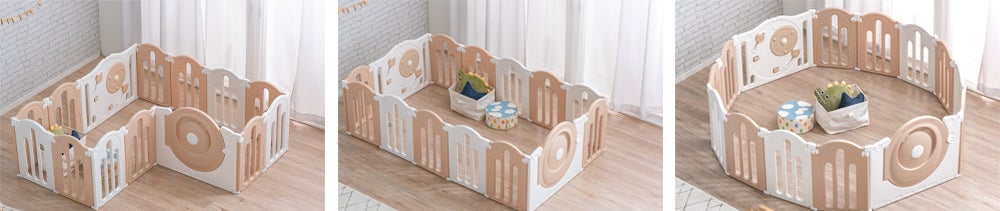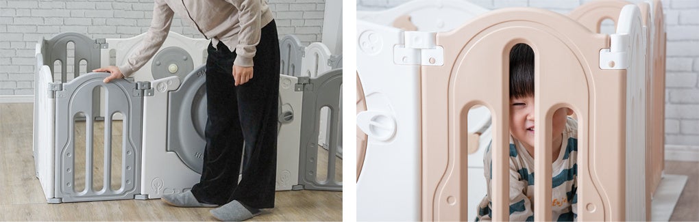 折り畳み式の本製品は、お部屋のスペースに合わせてスマート設置が可能です。丸形や長方形・L字型などお部屋の広さや家具の配置に合わせて自由自在にレイアウトすることもできます。また、パネルを追加で購入すると2つ以上のジョイントも可能になり、広いお部屋でもご使用いただけます。広いスペースを確保できる一方、パネルの枚数を減らすことでベビーサークルの広さを縮小することも可能なつくりとなっています。